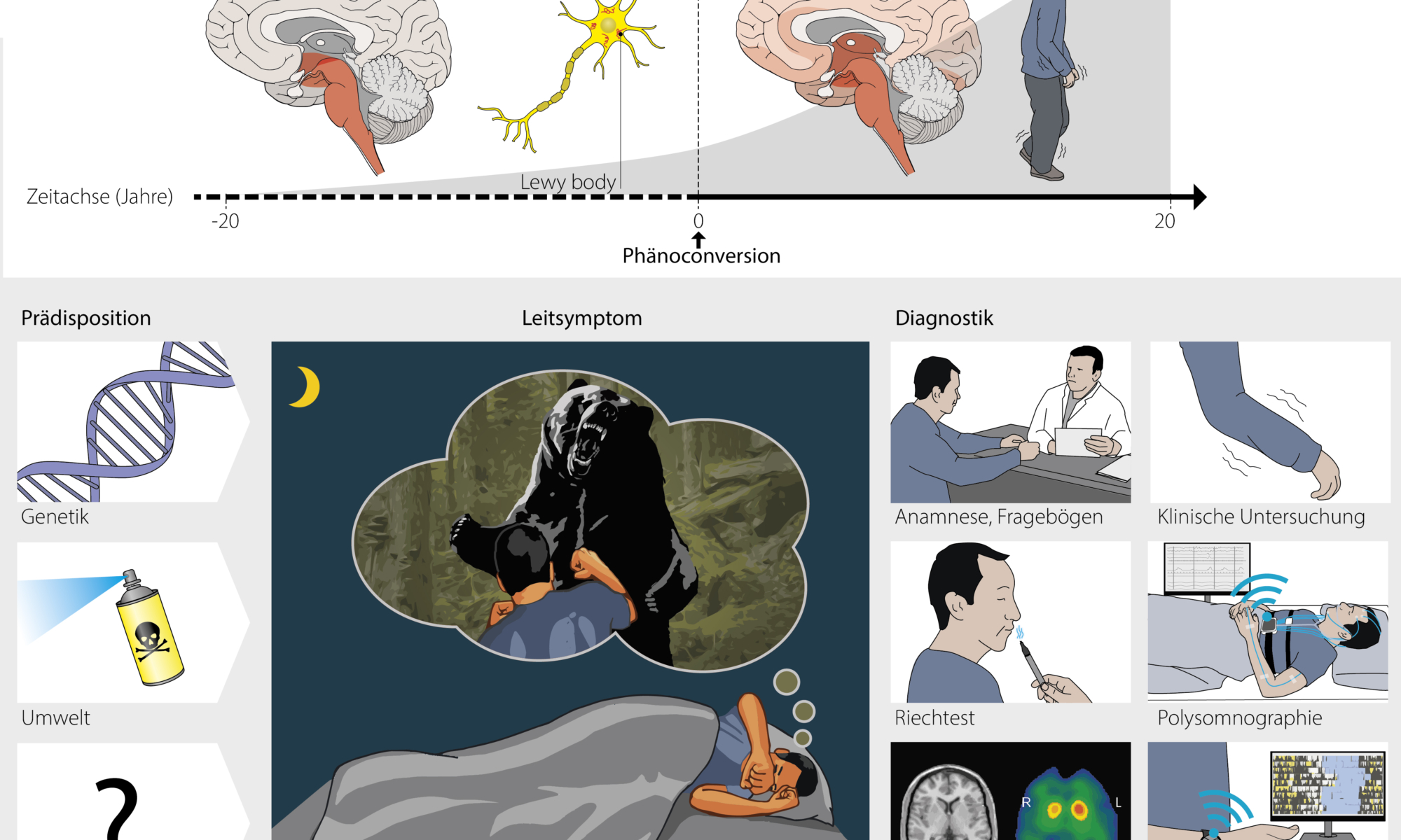 Bei einer isolierten RBD (iRBD) tritt die Störung ohne erkennbare zentrale Nervensystemerkrankung auf. Heute weiss man, dass es sich um ein frühes Stadium einer Alpha-Synukleinopathie handelt, also einer Gruppe neurodegenerativer Erkrankungen, zu denen die Parkinson-Krankheit (PD), die Demenz mit Lewy-Körpern (DLB) und die Multisystematrophie (MSA) gehören (6).