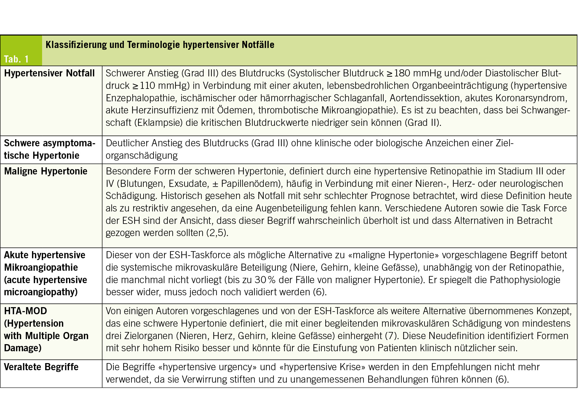 Die Klassifizierung schwerer Blutdruckanstiege basiert auf dem Vorliegen oder Nichtvorliegen einer organischen Schädigung. Die aktuellen Empfehlungen verschiedener Fachgesellschaften betonen die Abschaffung bestimmter historischer Begriffe, die zu Verwirrung führen, und die Einführung einer standardisierten Terminologie, die in Tab. 1 dargestellt ist (2–4).