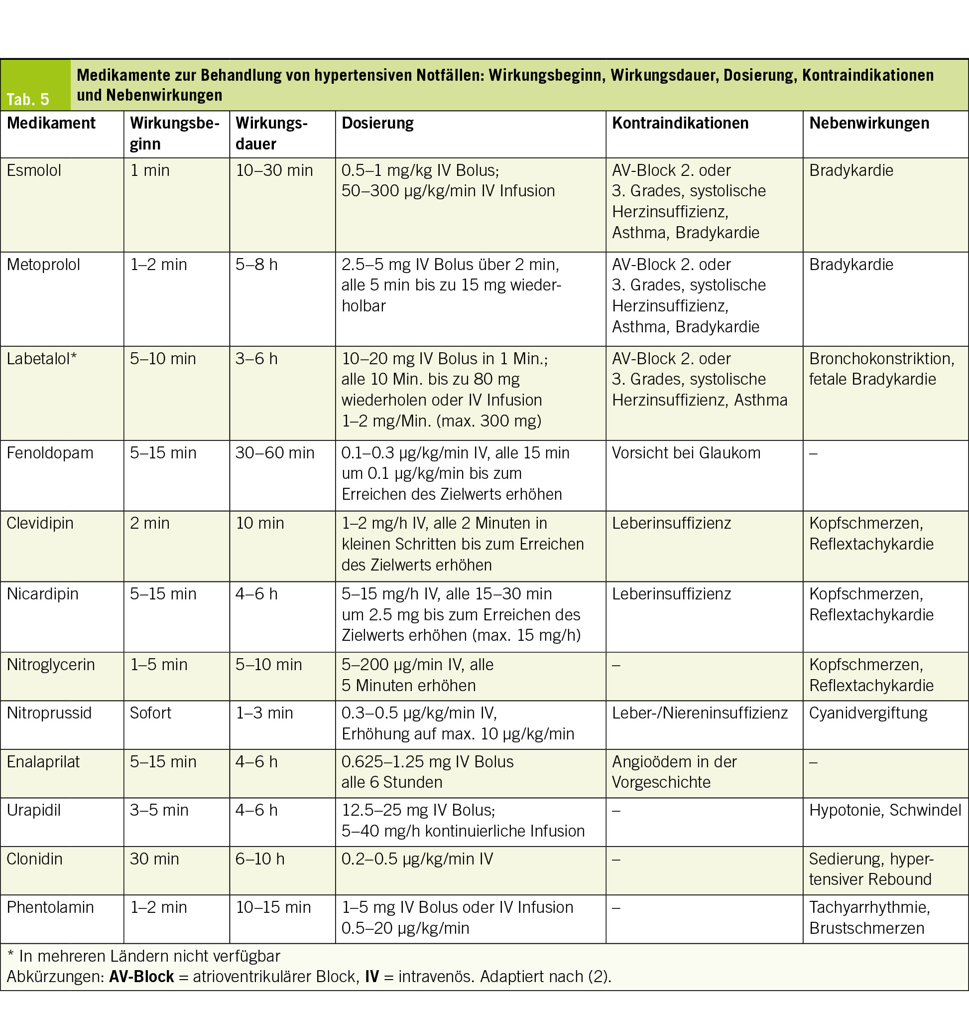 Die Wahl der blutdrucksenkenden Mittel hängt stark vom klinischen Kontext und der lokalen Verfügbarkeit ab. Am häufigsten wird Labetalol (α- und β-Blocker) verwendet, das oft als erste Wahl bevorzugt wird, insbesondere bei neurologischen Notfällen und Aortendissektionen, sowie Nicardipin, ein weit verbreiteter und gut verträglicher Kalziumkanalblocker, der auch bei Niereninsuffizienz eingesetzt werden kann. Weitere Optionen sind Esmolol (ein sehr kurz wirksamer β-Blocker), Nitroglycerin (insbesondere bei Lungenödem oder akutem Koronarsyndrom) oder Natriumnitroprussid, dessen Verwendung bei intrakranieller Hypertonie vermieden werden sollte, können je nach Indikation in Betracht gezogen werden. In der Praxis hängt die Auswahl des Wirkstoffs von der klinischen Situation, den Begleiterkrankungen, der Fachkompetenz des behandelnden Teams und den Überwachungsmöglichkeiten ab. Die pharmakologischen und praktischen Eigenschaften der einzelnen Wirkstoffe sind Tab. 5 zu entnehmen.
