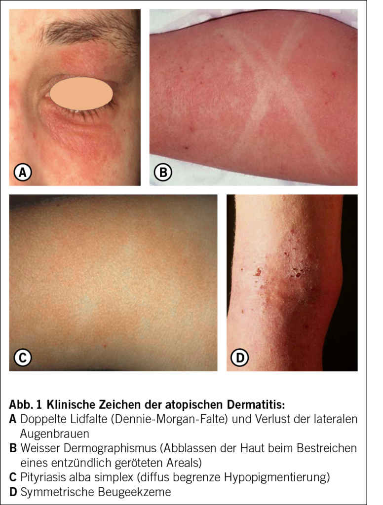 Die atopische Dermatitis (AD), auch Neurodermitis genannt, ist eine der häufigsten chronisch-entzündlichen Hauterkrankungen. Sie ist gekennzeichnet durch einen chronischen Verlauf mit trockener Haut, einen oft sehr stark belastenden Pruritus und diverse Hautveränderungen wie symmetrische Beugeekzeme oder «Head and Neck Type» vor allem bei Erwachsenen. Zusätzlich gibt es diverse andere Hautstigmata (Abb. 1). Sie betrifft Kinder und Erwachsene und ist mit einer erheblichen Beeinträchtigung der Lebensqualität verbunden (1, 2). Die Pathogenese ist multifaktoriell und umfasst genetische, immunologische und Umweltfaktoren (3, 4). In den letzten Jahren haben neue Erkenntnisse zur Pathophysiologie zu innovativen Therapieansätzen geführt und so die Behandlungsmöglichkeiten erweitert.