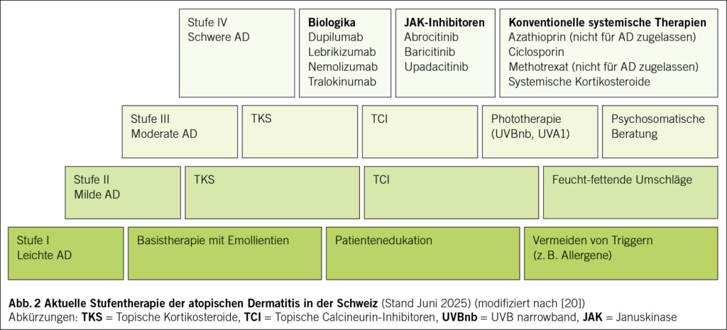 Die AD ist durch eine gestörte Hautbarriere und eine Fehlregulation des Immunsystems gekennzeichnet. Genetische Prädispositionen, insbesondere Mutationen im Filaggrin-Gen bei kaukasischen Patienten, führen zu einer erhöhten Permeabilität der Haut (5). Immunologisch dominieren Th2-vermittelte Entzündungsreaktionen mit erhöhter Produktion von Interleukin-4, -13 und -31 (6). Diese Erkenntnisse haben zur Entwicklung gezielter Therapien geführt, welche bei schweren Verläufen eingesetzt werden können. Das Therapieschema basiert auf einem stufenweisen Vorgehen, abhängig vom Schweregrad der Erkrankung sowie Ansprechen und Nebenwirkungen der jeweiligen Therapie (Abb. 2).