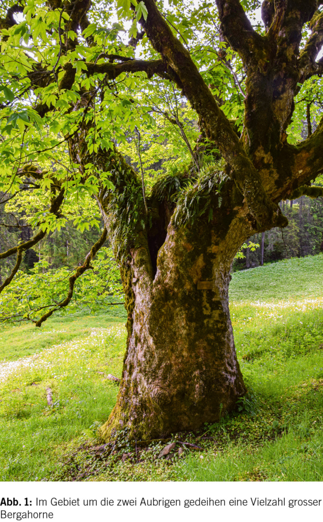 Wir starten auf der Sattelegg und wählen am Südende des grossen Parkplatzes das gegen Südosten weisende Fahrsträsschen, das durch Moorgebiet über Schwanten und Steinwändli zur Alp Unter Alten führt. Immer wieder begegnen wir in diesem Gebiet und später an der Südostflanke des Chli Aubrig mächtigen Bergahornen (Abb. 1). Hier befinden wir uns unmittelbar unter den hoch aufschiessenden Flühen des Chli Aubrig. Im Osten verlegt uns, nun schon nahe, der wesentlich behäbigere Klotz des Gross Aubrig den Blick in Richtung des Wäggitals. Dazwischen liegt das tief eingeschnittene Tal des Chratzerlibachs. Nun gilt es in den Sommermonaten zu entscheiden, ob wir der Einkehr wegen den Bach zur Alp Ahoreli hinüber queren oder die Höhe halten und an der Ostflanke des Chli Aubrig entlang Richtung der Alp Ober Alten weiterziehen wollen. Beide Wegvarianten sind etwa gleich lang. Die erste zwingt zu etwas mehr Höhenmetern, ermöglicht dafür eine Stärkung im Bergbeizli von Ahoreli, die zweite umrundet den Talkessel mehr oder weniger eben aus. Nur wer dort hin geht hat auch die freudige Qual der Wahl.