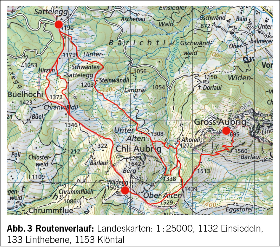 Auf dem Hinweg kehren wir bis zum zweiten Sattel mit der Höhenquote 1439 Meter zurück, wo wir uns gegen Süd­westen wenden. Eben aus, am Rande der Weiden der Alp Ober Alten, queren wir den Nordhang des Nüssen hinüber zur Krete, über die wir nach kurzer Zeit die Wildegg erreichen. Nun bleibt nur noch die sanft abfallende Rückkehr durch die Westflanke des Chli Aubrig zur Alp Chrähwäldli und von dort leider wenig gefällig über das Fahrsträsschen zur Sattelegg zurück. Wer sich den grössten Teil des Fahrsträsschens ersparen will, der nimmt eine kleine Gegensteigung bis zum Sattel östlich der Büelhöchi (Geländepunkt 1372 Meter) in Kauf (Abb. 3). Aber vielleicht, wer weiss, hat jemand doch noch nicht genug der herrlichen Rundsicht und steigt noch schnell oder gemütlich zum Chli Aubrig auf, der auch im Winter von Euthal aus Anlass für eine wunderbare Rundwanderung mit den Schneeschuhen bietet.