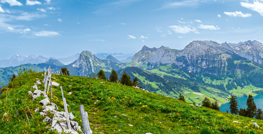 Nach dem Abstieg in den Sattel braucht es ein gutes Auge, um die wenigen ausbleichenden Wegmarkierungen sowie die spärlichen Trittspuren in der Bergwiese ausmachen zu können, die talabwärts zwei gegen Süden herunterziehende Felsrippen umgehen. Es gehen also ein paar weitere Höhenmeter verloren, bevor wir praktisch weglos den von der Alp Bärlaui heraufführenden Pfad erreichen, der nun zu einem zwar stotzigen, aber gut begehbaren Weg wird, über den wir schliesslich die im Süden des Gipfels liegende Hangschulter mit dem von weitem sichtbaren Stall gewinnen. Anschliessend stossen wir, direkt gegen Norden über die Wiese aufsteigend, wieder auf Pfadspuren, die uns den Weg zum Gipfel weisen. Hier öffnet sich nun auch der Blick gegen Norden auf die Seenplatte rund um den Zürichsee. Im Osten ragen der Säntis und die Churfirsten auf, im Süden blitzt die vereiste Kappe des Tödi herüber, im Westen fallen neben vielen anderen Gipfeln Urirotstock, Mythen, Rigi und Pilatus ins Auge (Abb. 2).
