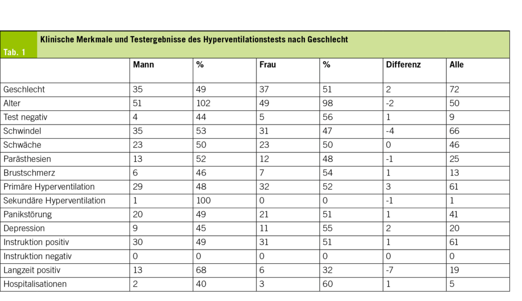 Der Hyperventilationstest wurde bei 72 Personen durchgeführt. Das mittlere Alter betrug 50.5 Jahre (30–81 Jahre; Männer 51 Jahre, Frauen 49 Jahre), 37 waren weiblich (51 %). Bei 13 % liessen sich die Alltagssymptome durch den Hyperventilationstest nicht reproduzieren. Bei den 87 % mit positivem Hyperventilationstest traten Schwindel in 92 %, ein Schwächegefühl in 64 %, Kribbeln am Körper in 35 % und Brustbeschwerden in 18 % auf. Ein primäres Hyperventilationssyndrom lag bei 85 % vor; 1 % (eine Patientin nach Myokardinfarkt) litt an einem sekundären Hyperventilationssyndrom infolge einer Linksherzinsuffizienz. Panikattacken wurden von 57 % und Depressionen von 28 % der Betroffenen angegeben. 85 % empfanden die Instruktionen als hilfreich, und bei 26 % waren sie auch langfristig hilfreich. Frühere Hospitalisationen wegen Panikattacken oder Hyperventilationssymptomen lagen bei 7 % vor. Während des Hyperventilationstests wurden bei keiner Person ischämietypische EKG-Veränderungen festgestellt. Alle Ereignisse und anamnestischen Hinweise traten bei Männern und Frauen praktisch gleich häufig auf (Tab. 1). Weitere Diagnosen bei Personen mit positivem Hyperventilationstest waren arterielle Hypertonie (N = 4), Asthma (N = 4), Atherosklerose (N = 6), anamnestisch vasovagale Ereignisse (N = 8), bekannte koronare Herzkrankheit (N = 4), Bradykardie (N = 1), nicht-ischämische Kardiomyopathie (N = 2), Aortendilatation 63 mm (N = 1) sowie COPD (N = 1). Bei 32 Personen lagen keine relevanten Begleiterkrankungen vor.