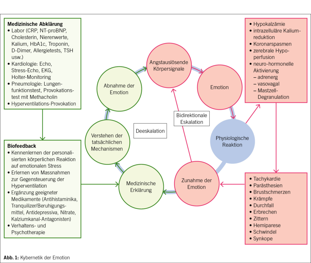 Panikattacken und Hyperventilationsattacken stehen in einer bidirektionalen Beziehung: Eine Panikattacke löst häufig eine Hyperventilationsattacke aus, und die hyperventilationsassoziierten Symptome wiederum erhalten oder verstärken die Panikattacke im Sinn eines «Teufelskreises» (14). Das ist ein weiterer Grund, weshalb es Âwichtig ist, dass Betroffene durch eine kurze (!) Hyperventilation die Körperreaktion kennenlernen und die vermeintlichen Gefahren der Symptome einordnen können (15). In unserer Beobachtungsserie war dies für die meisten hilfreich.