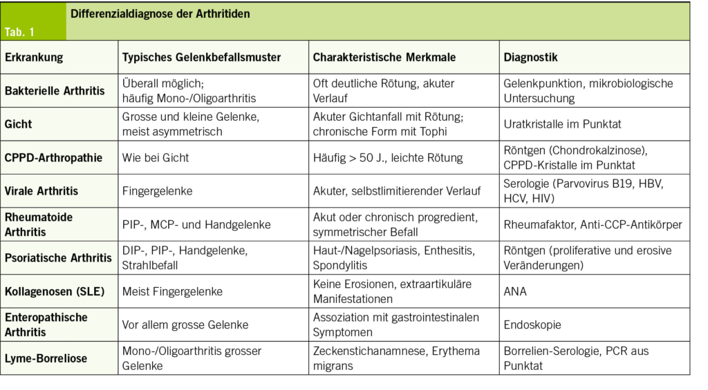Die Unterscheidung der verschiedenen Arthritiden erfolgt anhand von Gelenkbefallsmuster, klinischen Besonderheiten und spezifischer Diagnostik (Tab. 1).