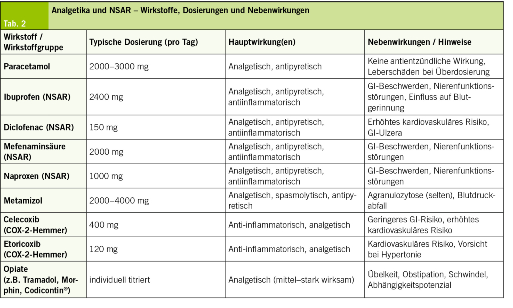 Zu den lokalen Anwendungen zählt insbesondere Arnika, deren Blüten ätherisches Öl, Flavonoide und Sesquiterpenlactone enthalten, die entzündungshemmend wirken. Daneben wurden Thymol in Form von Estern und Ethern, Hydroxycumarine, Phenylacrylsäuren sowie immunstimulatorische Polysaccharide nachgewiesen, die zusätzlich antiseptisch wirken. Eine randomisierte, doppelblinde, placebokontrollierte Studie mit 162 Patientinnen und Patienten zeigte, dass die tägliche Einnahme von 800 mg Chondroitinsulfat im Vergleich zu Placebo eine signifikante Schmerzreduktion und eine Verbesserung der Handfunktion bei gutem Sicherheitsprofil bewirkte. Systemische Therapieoptionen umfassen Paracetamol, nichtsteroidale Antirheumatika (NSAR) und Opiate. Eine Übersicht zu Dosierungen, Wirkungen und Nebenwirkungen dieser Substanzen bietet Tab. 2.