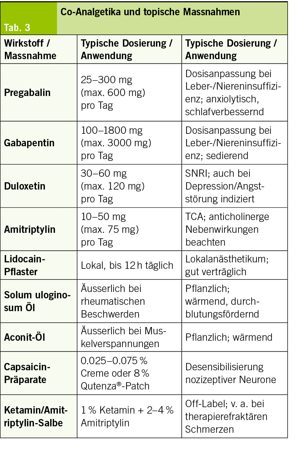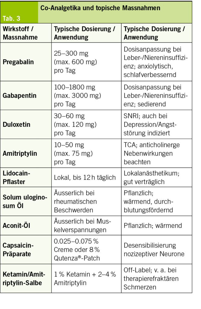Für die Behandlung neuropathischer Schmerzen stehen neben den bereits genannten Antidepressiva und Antikonvulsiva auch topische Therapien zur Verfügung. Eine Übersicht der wichtigsten Substanzen, Dosierungen und Besonderheiten findet sich in Tab. 3.
