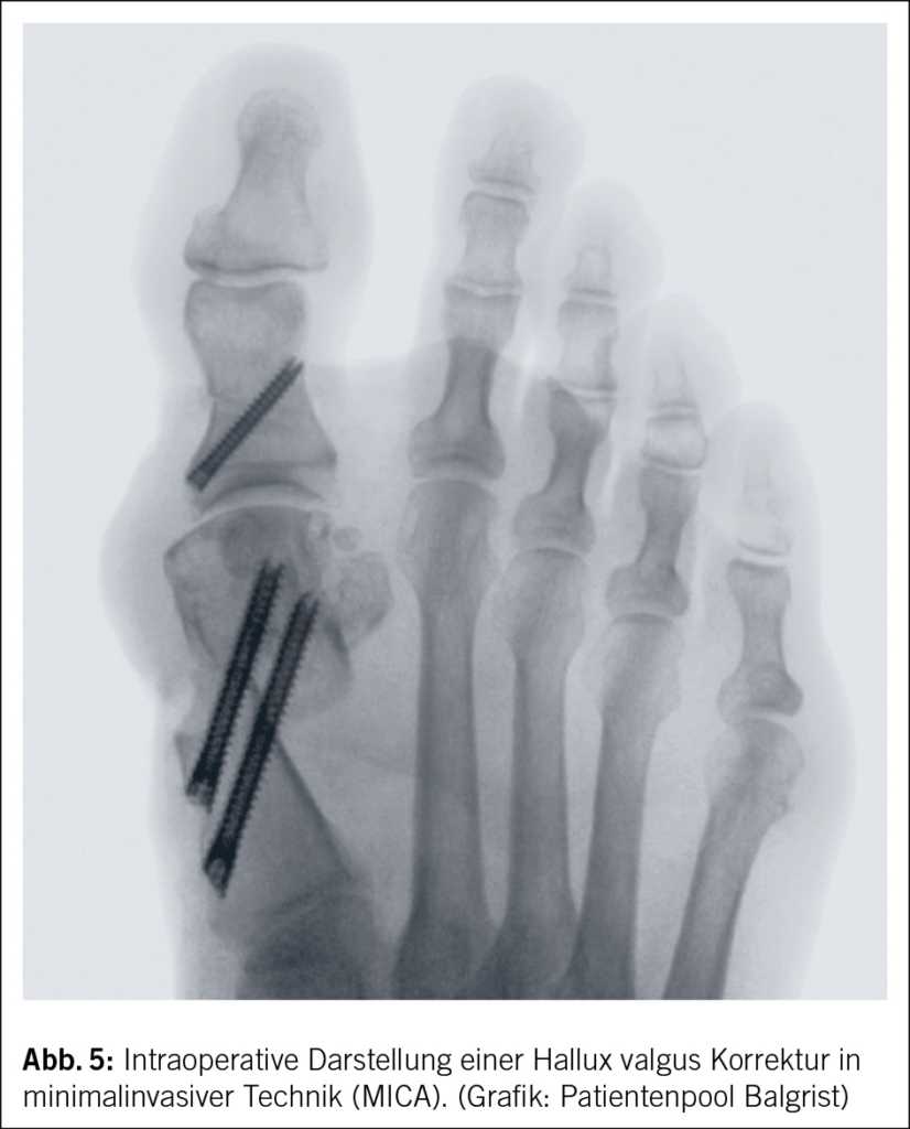 Aktuell im Trend sind auch minimalinvasive Hallux valgus Operationen, auch MICA genannt (Minimal Invasive Chevron and Akin osteotomy) (Abb. 5). Die aktuell nun dritte Generation, mit Schraubenfixierung befestigte Variante osteotomiert das Metatarsale über diverse kleinere Schritte und fixiert es anschliessen mit grosskalibrigen langen Schrauben (28, 29). Die MICA konnte sich gegenüber den herkömmlichen Verfahren allerdings noch nicht als besser beweisen, so können mit der MICA Versorgung jedoch gewisse Indikationen erweitert werden, die bislang mit einer Versteifung versorgt wurden.