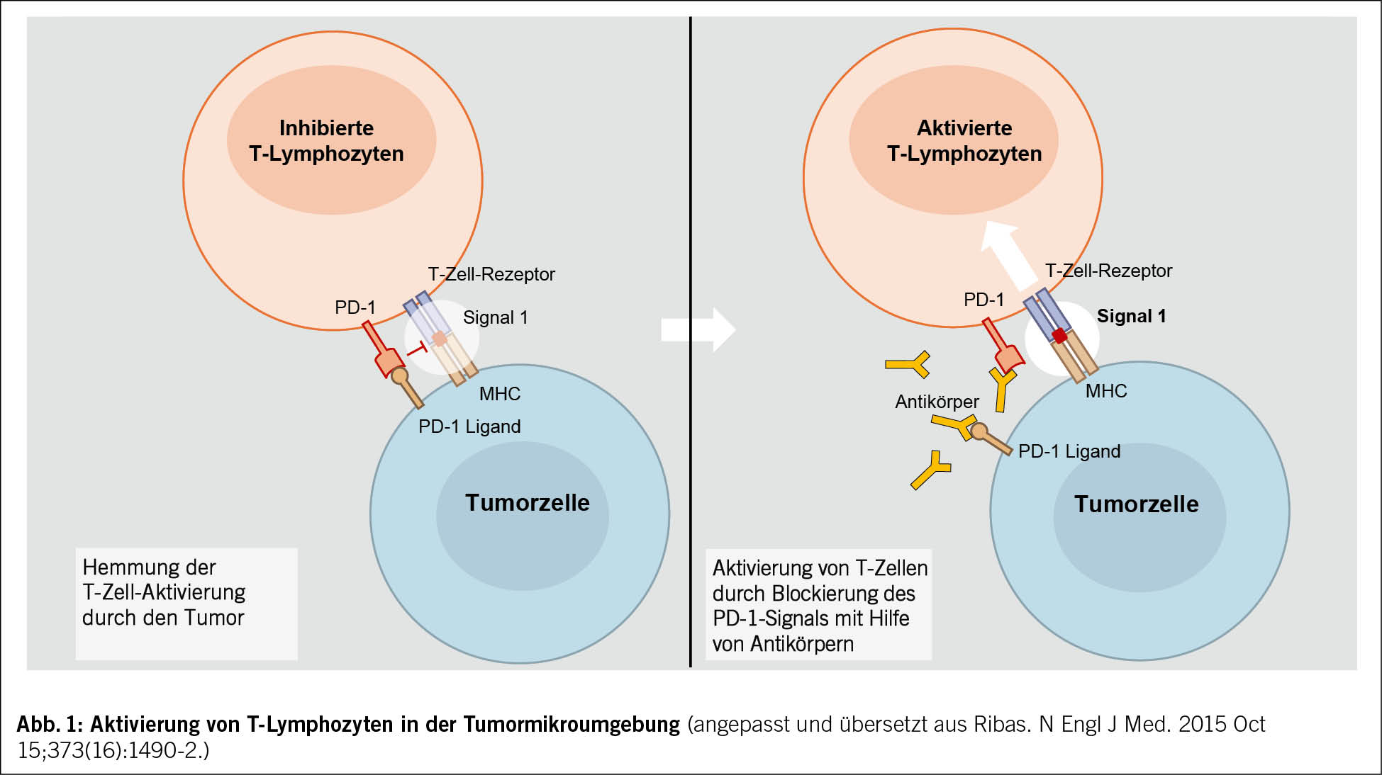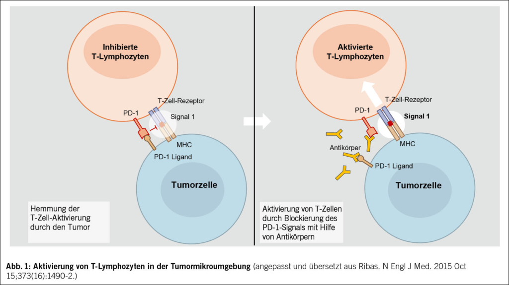 Unter diesen Kontrollpunkten haben vor allem die Interaktion zwischen PD-1 und PD-L1 sowie die zwischen CTLA-4 und Antigen-präsentierenden Zellen die Onkologie revolutioniert (2). Andere Kontrollpunkte wie LAG-3, TIGIT oder TIM-3 sind Gegenstand jüngster Entwicklungen, werden jedoch in diesem Manuskript nicht behandelt (3). Tab. 1 beschreibt die Namen der Moleküle und ihre Zielstrukturen, die in der Schweiz verfügbar sind.