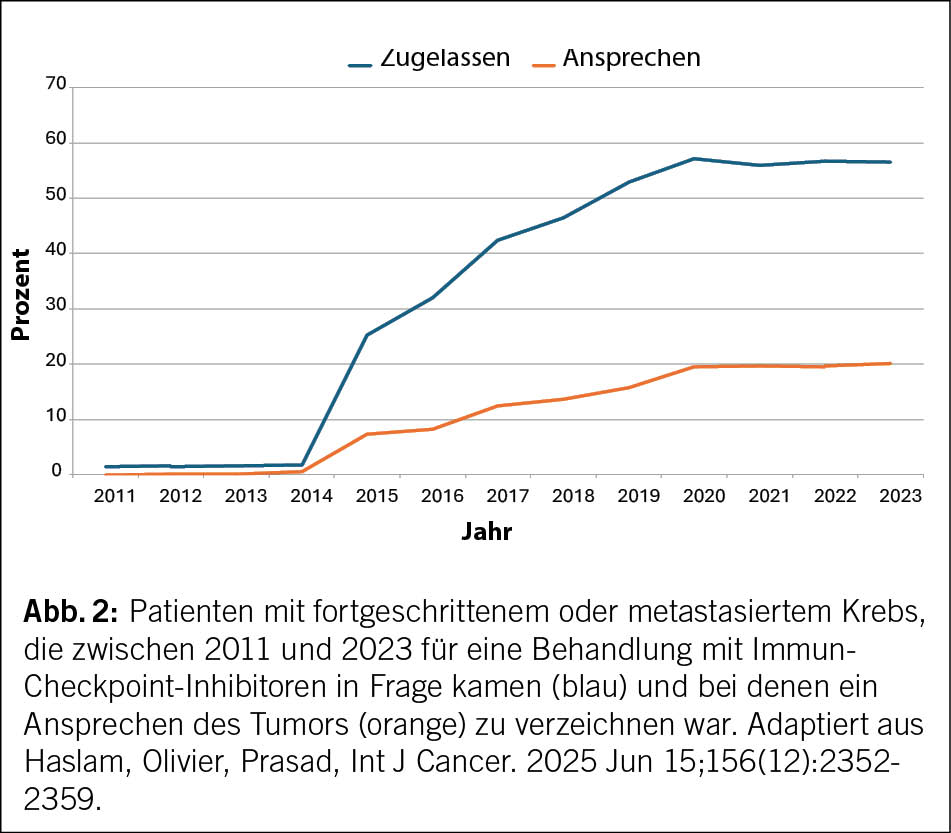 Das Beispiel des Melanoms verdeutlicht aber auch die Grenzen der Immuntherapie: Es handelt sich um eine im Vergleich zu anderen Krebsarten relativ seltene Krebsart im fortgeschrittenen Stadium. Dies erklärt, warum bis heute unter Berücksichtigung der Häufigkeit der einzelnen Krebsarten nur etwa 20 % der Patienten mit fortgeschrittener Erkrankung von einem Ansprechen des Tumors auf die Immuntherapie profitieren (8). Darüber hinaus wird nur ein Bruchteil dieser Patienten einen dauerhaften Nutzen daraus ziehen. Die Entwicklung der Anzahl der Patienten mit fortgeschrittener oder metastasierter Erkrankung, die für die Therapie in Frage kommen, d. h. bei denen eine Indikation für die Therapie vorliegt, und derjenigen, die auf die Therapie ansprechen, ist in Abb. 2 dargestellt. Mit anderen Worten: Obwohl die Immuntherapie für bestimmte Patienten eine Revolution darstellt, kommt sie bisher nur einer Minderheit der Patienten mit fortgeschrittener Erkrankung zugute.