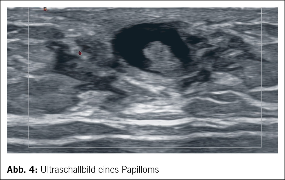 Papilläre Neoplasien treten bei Männern sehr selten auf. In der Literatur finden sich nur wenige Fallbeschreibungen. Eine retrospektive Datenbankanalyse über 19 Jahre konnte 117 Männer mit einer papillären Neoplasie identifizieren. Diese Studie konnte aufzeigen, dass papilläre Neoplasien ohne Atypien insbesondere bei jungen Männern auftreten und insgesamt sehr selten sind. Der grösste Anteil der papillären Neoplasien war mit einem DCIS oder einem Karzinom assoziiert (6). Abb. 4 zeigt ein Papillom bei einem 34-jährigen Mann, der sich aufgrund eines Tastbefundes vorstellte. Der Befund wurde mit einer sonografisch gesteuerten Stanzbiopsie abgeklärt und bei fehlenden Atypien mittels sonografisch gesteuerter Vakuumbiopsie entfernt.