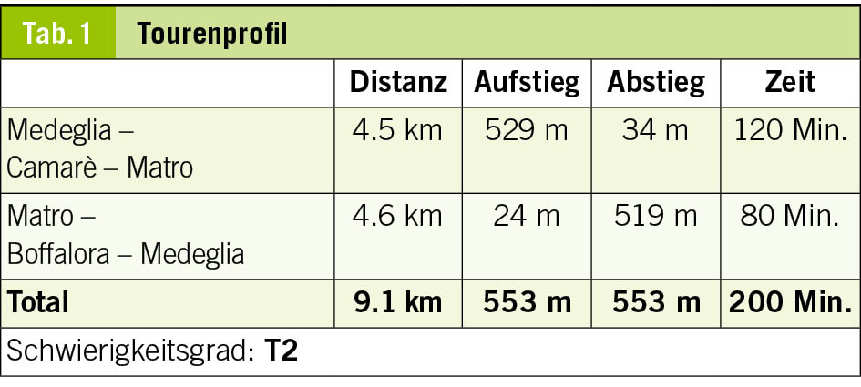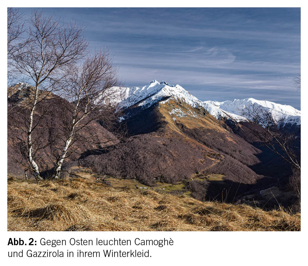 Wir umgehen den Hügel mit der Höhenquote 962 Meter gegen Westen und gelangen so auf ein Strässchen, das gegen Nordosten zu den Häusern von Camarè hinaufführt. Nach der Rechtskurve zweigt in nördlicher Richtung ein schmaler Pfad ab, der uns zu den Häusern von In Sèll bringt, die – nomen est omen – in einem Sattel liegen. Dort öffnet sich erstmals der Blick über die Piano di Magadino zu den Berghängen des Sopraceneri. Gleichenorts stossen wir auf die alte Militärstrasse, die nördlich der Krete, also geschützt vor einem in den Weltkriegen erwarteten Beschuss aus dem Süden, die Stellungen im Bereich des gesamten Bergkammes zwischen Cima di Dentro und Cima di Medeglia erschliesst. Bis unterhalb der Häuser von Pedrinasco kommen wir zweimal an in den Felsen geschlagenen Unterständen vorbei. Die Militärtrasse quert den stotzigen Südhang des Matro in Richtung des Westgrats. Kurz nachdem wir diesen passiert haben und die Strasse sich zu senken beginnt, zweigt bergwärts ein unscheinbarer schmaler Pfad ab, der offensichtlich vor nicht langer Zeit vom Gestrüpp befreit worden ist. Dieser führt uns in mehreren Kehren durch den steilen, von Felsen durchsetzten Hang direkt zum Gipfel des Matro hinauf. Hier gebietet das im Herbst und Winter am Boden liegende, trockene Gras zur Vorsicht und verlangt gutes Schuhwerk sowie Trittsicherheit. Es besteht die Möglichkeit, diese stotzige Wegpartie gegen Osten zu umgehen und über den nordöstlichen Gratrücken den Gipfel zu gewinnen.