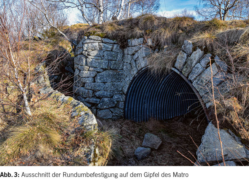Je mehr wir uns dem Gipfel auf dem direkten Pfad nähern, desto häufiger stossen wir auf alte Wegbefestigungen in Form von Trockensteinmauern und Treppen. Zuoberst erwarten uns dann gemauerte Lauf- und Schützengräben, die den gesamten Gipfel umschliessen. Im Schutz der Schützengräben wurden während des 1. Weltkrieges zudem Unterstände nach amerikanischem Vorbild erstellt. Diese bestehen aus halbkreisförmigen Tunnels aus Wellblech, die mehrere Meter in den Berg getrieben und mit einer dicken Schicht aus Erde uns Gestein überdeckt wurden. Gegen Süden führt zudem ein Laufgraben steil zu einem vorgelagerten Schützengraben hinunter, der auf einem Felsvorsprung liegt und den kleinen Passübergang bei Pedrinasco dominiert (Abb. 1 bis 3).