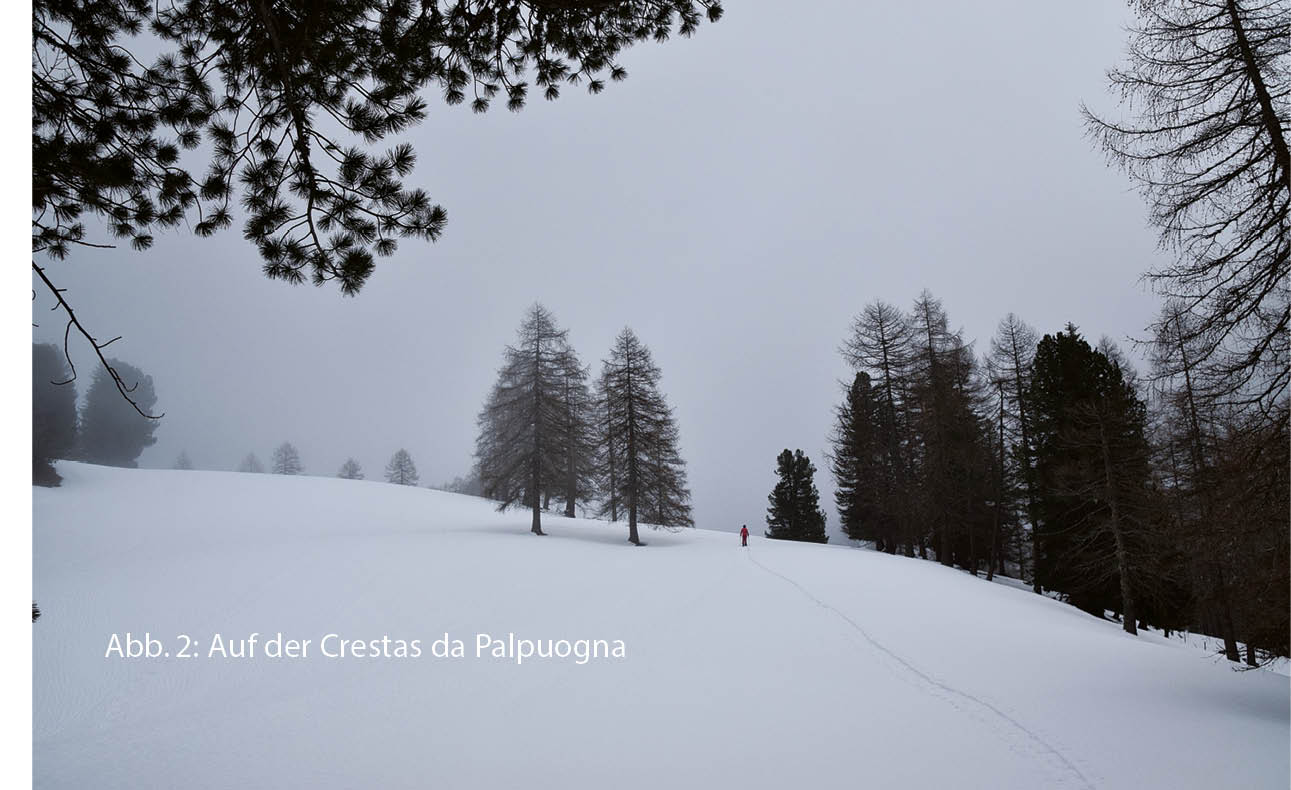 Den dritten Tag lassen wir bei leichtem Schneefall ruhiger angehen. Mit der Rhätischen Bahn fahren wir nach Preda und beginnen dort talaufwärts unsere Rundwanderung mit den Schneeschuhen entlang der Albula-Passstrasse. In der ersten Haarnadelkurve zweigt der Trail gegen Südwesten zu den Häusern von Palpuogna ab. Mit einem Schlenker nach Osten erreichen wir schliesslich die gleichnamige Crestas und später wieder die Passstrasse (Abb. 2). Auf dieser gehen wir weiter bis zur Alp Crap Alv, wo wir die Alvra auf der Strassenbrücke überschreiten können. Am gegenüberliegenden Ufer folgen wir der Trasse des Sommerwanderwegs über den Moränenrücken am Fuss des Crap Alv zum Lai da Palpuogna hinunter. Der See liegt zu dieser Jahreszeit noch unter einer dicken Eis- und Schneedecke verborgen. Entlang des Südufers erreichen wir das Stauwehr mit dem alten Kraftwerk, das bereits über hundert Jahre Strom für das Tal produziert. Über die zweite kleine Holzbrücke kehren wir ans Nordufer der Alvra zurück und erreichen durch den God Lavizun wieder den Ausgangspunkt unserer kleinen, im Nebel und Schneetreiben mystischen Rundwanderung. Bei dem Hudelwetter lassen wir uns das herrlich mundende Fondue im Hotel Preda Kulm nicht entgehen, bevor wir mit dem Zug wieder nach Bravuogn zurückkehren.