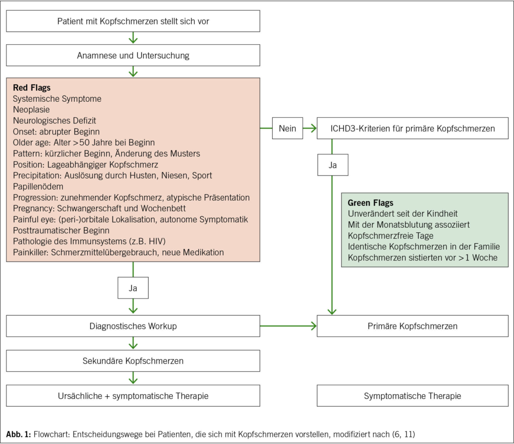 Bei der Vorstellung von Patienten mit Kopfschmerzen gelingt die Unterscheidung zwischen primären und sekundären Kopfschmerzen durch eine strukturierte und kopfschmerzspezifische Anamnese und neurologische Untersuchung. Hilfreiche Instrumente in der Differenzialdiagnostik sind «Red Flags» und «Green Flags». Je nach Verdachtsdiagnose kann dann entschieden werden, welche Diagnostik und Therapie für den individuellen Kopfschmerzpatienten gewählt werden sollten.