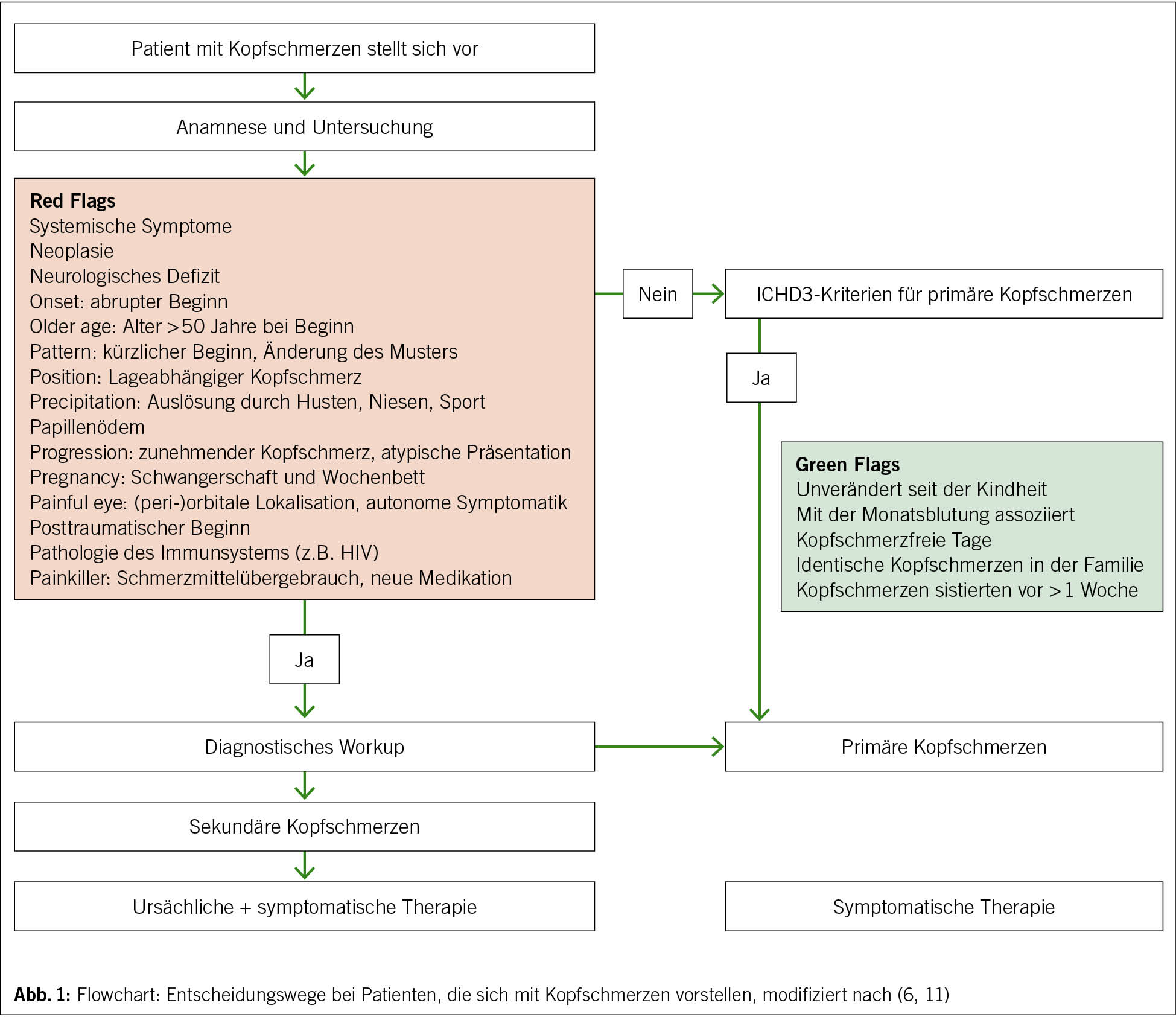 Das Vorgehen im klinischen Alltag zeigt Abb. 1. Stellen sich Patienten mit Kopfschmerzen vor, wird in Anamnese und klinischer Untersuchung auf «Red Flags» und «Green Flags» geachtet. Bei fehlenden «Red Flags» sollte geprüft werden, ob der berichtete Kopfschmerz mit den ICHD3-Diagnosekriterien für primäre Kopfschmerzen übereinstimmt. Ist dies nicht der Fall, sind die «Green Flags» Hinweise auf das wahrscheinliche Vorliegen eines primären Kopfschmerzes. Beim Vorliegen von «Red Flags» wird weitere Diagnostik veranlasst. Zeigen sich hier unauffällige Befunde, ist ebenfalls mit einer hohen Wahrscheinlichkeit von dem Vorliegen eines primären Kopfschmerzes auszugehen.
