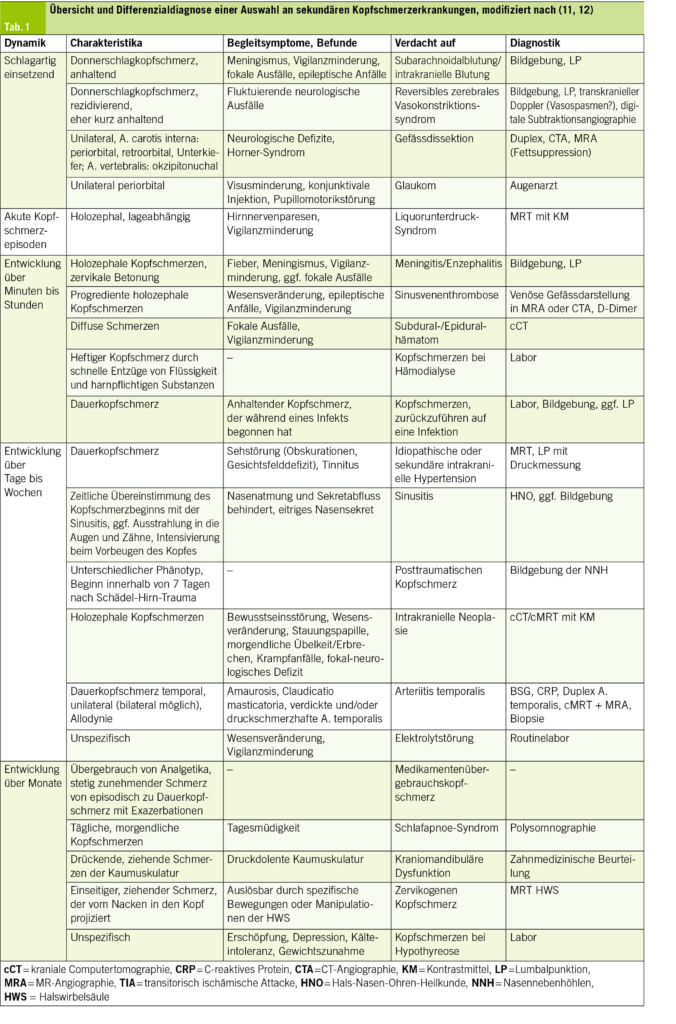 Mögliche Ursachen sekundärer Kopfschmerzen sind in der Tab. 1 aufgeführt.