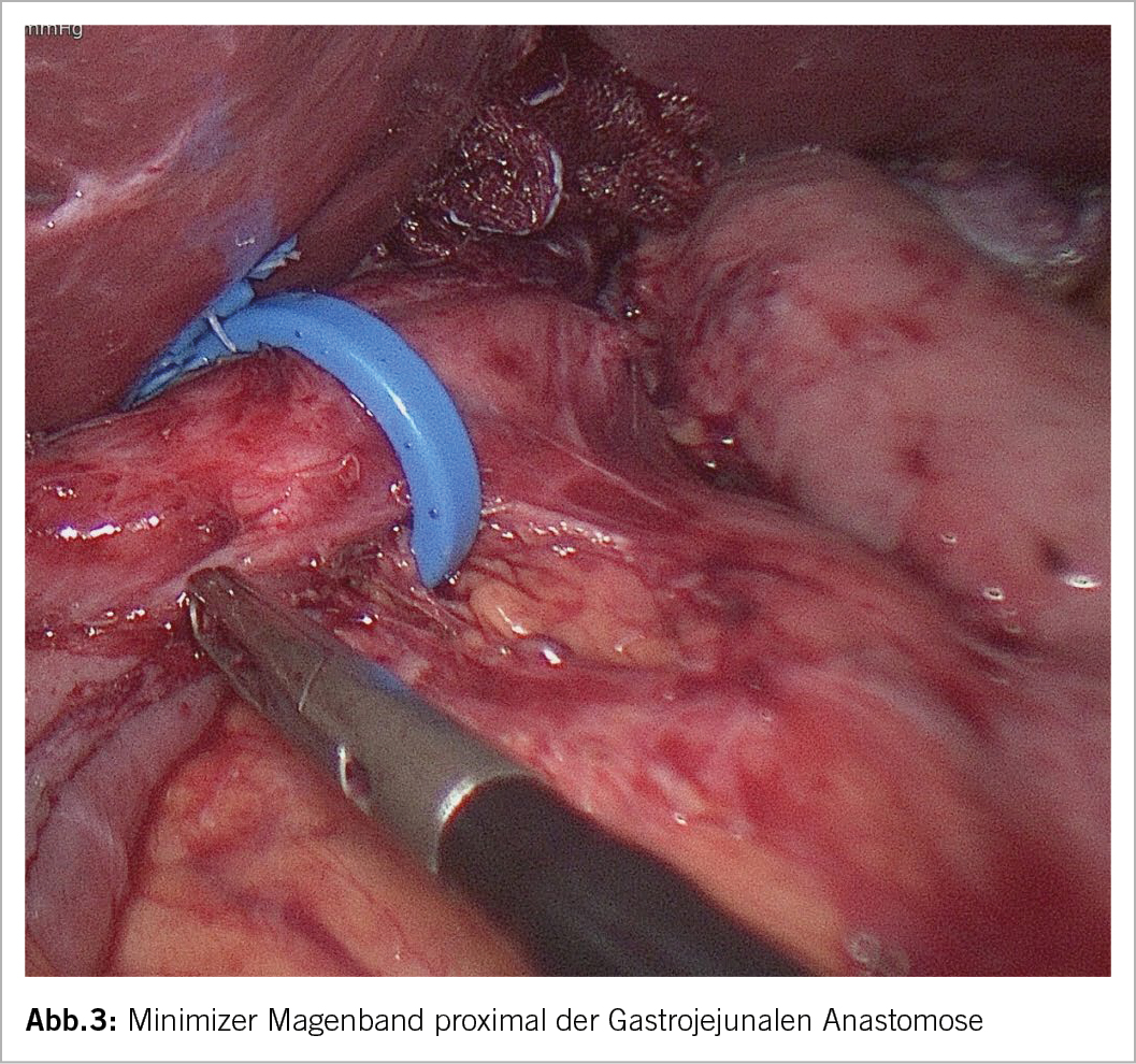 In unserem Adipositaszentrum favorisieren wir dagegen seit 7 Jahren eine sog. Magenoutletrestriktion, d.h. der Ćbergang vom kleinen Magenpouch in den Dünndarm wird durch ein laparoskopisch platziertes einfaches Magenband (Abb.ā3) vorsichtig eingeengt (9). Im Gegensatz zur transoralen endoskopischen Anastomosenraffung mit der Gefahr der erneuten Dilatation bleibt das Band stabil an Weite. SƤmtliche Verfahren ob endoskopisch oder laparoskopisch haben aber ihre Risiken wie Magenperforation, zu enge Naht mit Dysphagie, Refluxbeschwerden, Magenbandmigration und das Dumpingrezidiv.