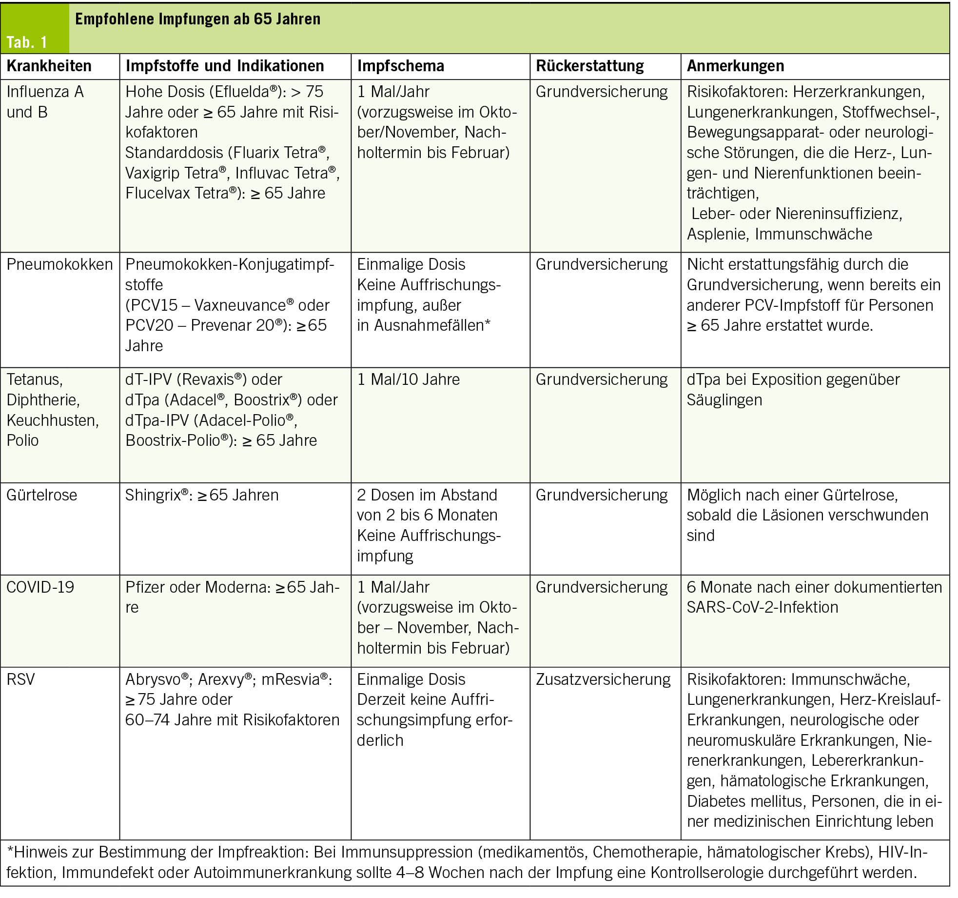 Das Immunsystem verändert sich im Laufe des Lebens. Ein Merkmal der Immunoseneszenz sind altersbedingte Veränderungen in Anzahl und Qualität der angeborenen und adaptiven Immunzellen. Beispiele hierfür sind eine Abnahme der Anzahl naiver B- und T-Zellen, eine Abnahme der Antikörperproduktion sowie eine Zunahme der Produktion proinflammatorischer Zytokine. Dadurch kann es zu einer chronischen, leichtgradigen Entzündung kommen, die als „Inflammaging” bezeichnet wird. Diese Veränderungen des Immunsystems erhöhen das Risiko von Komplikationen im Falle einer Infektion und verringern die Impfantwort (5, 6). Auch wenn die Wirksamkeit der Impfstoffe in dieser Bevölkerungsgruppe möglicherweise geringer ist, können sie dennoch die Schwere der Erkrankung verringern sowie Krankenhausaufenthalte, Komplikationen und Mortalität begrenzen (7). Die gemäß dem Impfplan 2025 ab 65 Jahren empfohlenen Impfstoffe sind in Tab. 1 zusammengefasst (4).