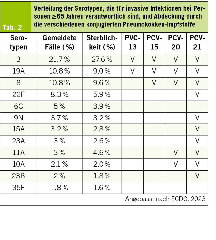 Es wurden über 100 Serotypen von Streptococcus pneumoniae identifiziert, von denen einige mit invasiven Erkrankungen wie Bakteriämien oder Meningitiden in Verbindung gebracht werden. Die Inzidenz und Mortalität invasiver Infektionen mit S. pneumoniae betrifft vor allem Kinder unter 5 Jahren und Erwachsene über 65 Jahren (20). Bei letzteren kann eine Pneumokokkeninfektion zu kardiovaskulären und pulmonalen Komplikationen sowie zu einem Verlust der Selbstständigkeit führen. Pneumokokken-Konjugatimpfstoffe (PCV) wurden entwickelt, um die Immunogenität zu verbessern und die Schutzdauer zu verlängern (21). Im Gegensatz zu Polysaccharid-Impfstoffen verbinden PCV die Polysaccharide mit einem Trägerprotein, wodurch eine Gedächtnisimmunität und Antikörper mit hoher Affinität ermöglicht werden (22). Aufgrund der begrenzten Serotypabdeckung der ersten PCV haben einige Länder weiterhin den 23-valenten Polysaccharid-Impfstoff verwendet, manchmal nach Verabreichung einer Dosis PCV-13. Mit der Einführung von PCV mit höherer Valenz (PCV-15, PCV-20) stehen nun mehr Optionen zur Verfügung. Tab. 2 zeigt die zehn Pneumokokken-Serotypen, die am häufigsten für invasive Infektionen (IIP) bei Personen ≥ 65 Jahren in Europa verantwortlich sind, sowie deren Abdeckung durch PCV gemäss den Daten des Europäischen Zentrums für die Prävention und die Kontrolle von Krankheiten (ECDC).