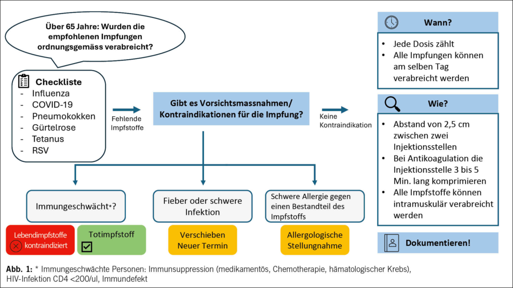 Der Anteil der Bevölkerung ab 65 Jahren steigt (1). Laut Angaben der Weltgesundheitsorganisation (WHO) basiert gesundes Altern auf der Erhaltung «der funktionellen Fähigkeiten, die das Wohlbefinden im fortgeschrittenen Alter ermöglichen» (2). Impfungen sind eine sichere und wirksame Präventionsmassnahme, die zu diesem Ziel beiträgt. Menschen ≥ 65 Jahre haben ein erhöhtes Risiko für schwere Infektionen mit kardiorespiratorischen und neurologischen Komplikationen sowie einem Verlust der Selbstständigkeit (3). Das Bundesamt für Gesundheit (BAG) aktualisiert jedes Jahr den Impfplan, der teilweise speziell auf diese Bevölkerungsgruppe zugeschnitten ist (4). Dennoch ist die Durchimpfungsrate nach wie vor gering, obwohl sie für die Vorbeugung schwerer Erkrankungen in dieser gefährdeten Bevölkerungsgruppe von entscheidender Bedeutung ist. Dieser Artikel bietet Ärzten praktische Hilfsmittel für die Impfung von Personen ≥ 65 Jahren und aktualisiert die Daten zu konjugierten Pneumokokken-Impfstoffen (PCV) und Impfstoffen gegen das Respiratorische Synzytial-Virus (RSV).