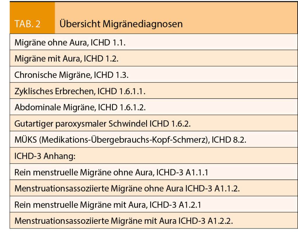 (International Classification or Headache Disorders, Tab. 1+2) angewendet. Wie beim DSM werden auf der Webseite der IHS (International Headache Society) Kriterien für über 200 Kopfwehtypen geboten. Da die Migräne auch eine Ausschlussdiagnose darstellt, ist heute eine MRI unerlässlich. Nur so können okkulte und schlummernde Ursache von sekundären Kopfschmerzen nachgewiesen werden.