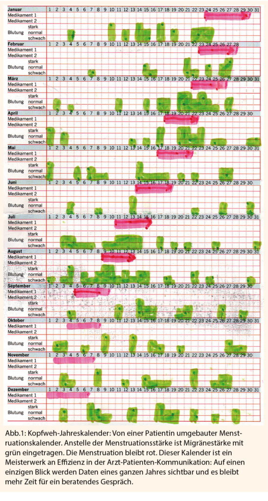Auf die hormonellen Schwankungen im normalen Monatszyklus reagieren ca. 50% der Migränikerinnen, am besten visualisierbar in einem einfachen kombinierten Kopfschmerz-Menstruations-Kalender (Abb. 1). Dort werden Kopfweh- und Migränetage eingetragen sowie Tage der Menstruation. Etwa die Hälfte der Betroffenen leiden einige Tag vor Einsetzen der Blutung an Migräne, die andere Hälfte zeitgleich mit der Blutung. Nur einige wenige berichten von Migränetagen im Anschluss nach der Blutung oder während der Ovulation.