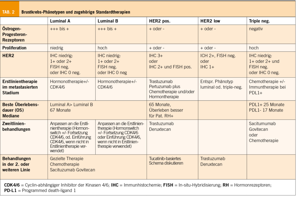 Die Behandlung jeder Patientin mit metastasierendem Brustkrebs, unabhängig von ihrem Alter, ist nicht kurativ und zielt darauf ab, den Krebs zu kontrollieren und die Lebensqualität zu erhalten. Wir beschränken uns auf die ersten Behandlungslinien (Tabelle 2).