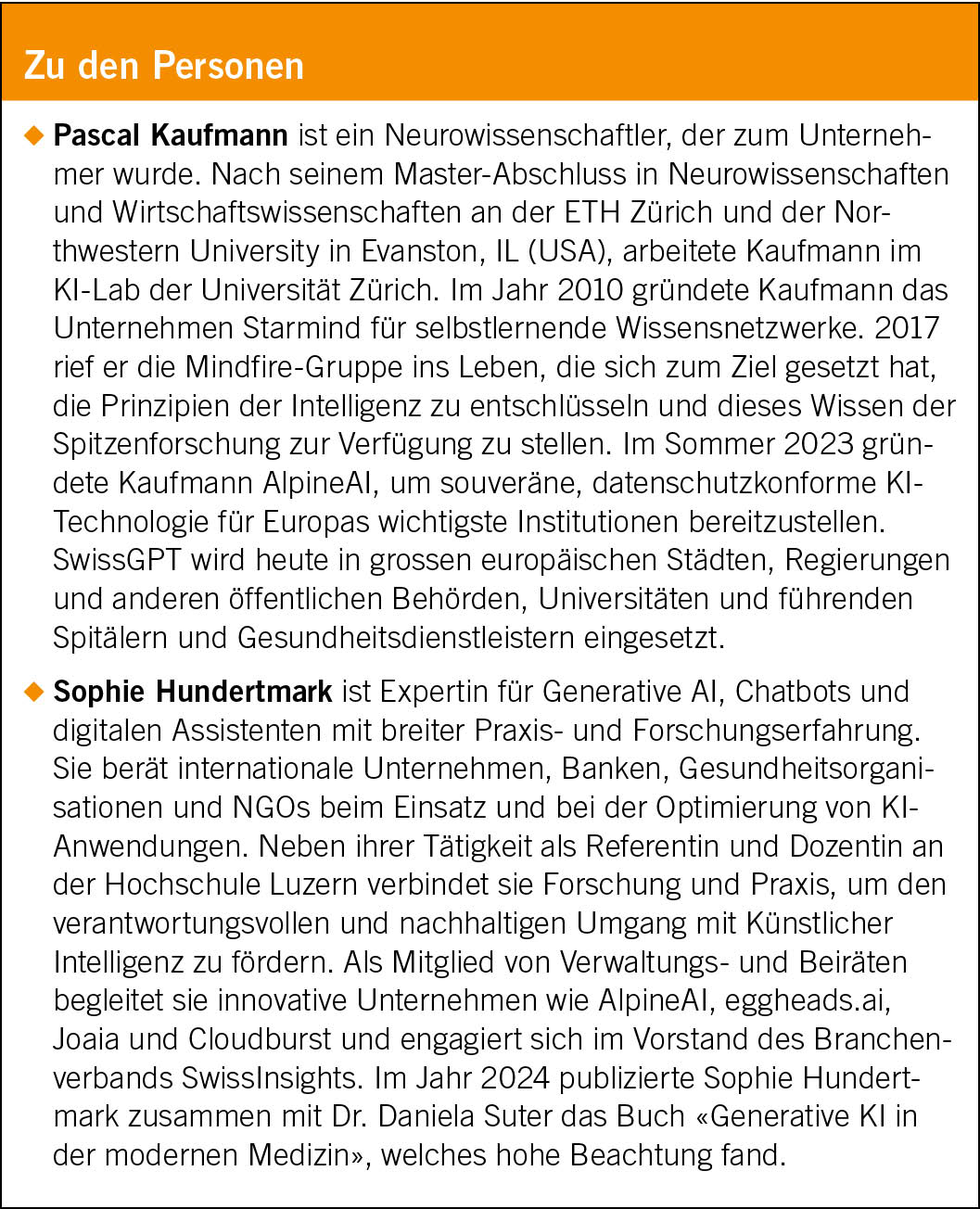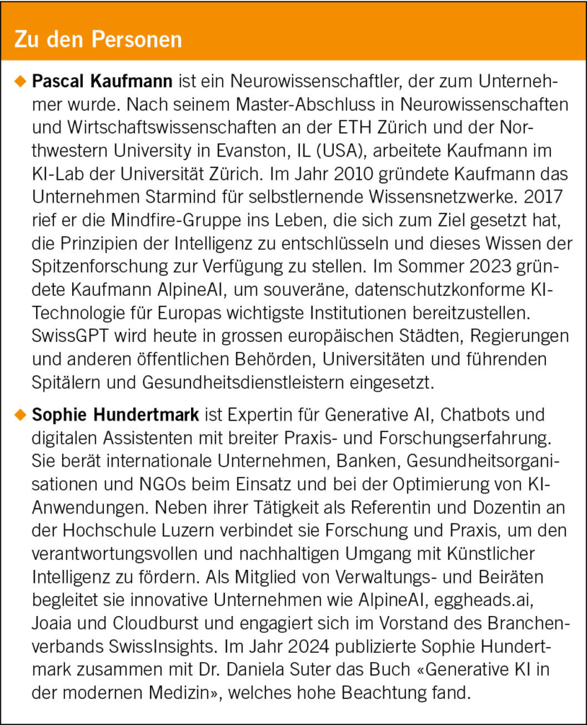 AlpineAI ist ein Unternehmen aus Davos, welches die KI-Plattform SwissGPT entwickelt hat und dessen Einsatz unter anderem auf das Gesundheitswesen fokussiert. Sein CEO, Pascal Kaufmann, sowie Sophie Hundertmark, Verwaltungsratsmitglied von AlpineAI und Autorin des Buches «Generative KI in der modernen Medizin», haben sich bereit erklärt, uns für ein Interview zur Verfügung zu stehen.