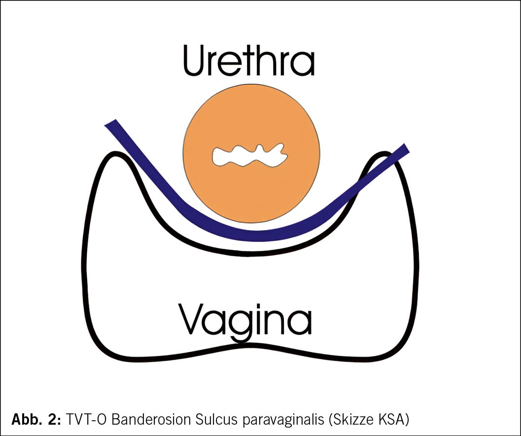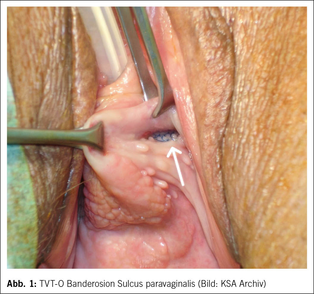 Die Gesamtkomplikationsraten sind gering, spezifische Risiken variieren jedoch je nach Verfahren. So zeigte sich bei der retropubischen Schlinge mit zunehmender Verbreitung der Technik eine Zunahme der Komplikationen aufgrund der Passage der Nadel durch das kleine Becken, allen voran Blasenperforationen in etwa 3 % der Fälle (1, 2). Allerdings variiert die Komplikationsrate von Operateur zu Operateur und ist seltener bei Chirurgen mit einer Mindesteinlagezahl von 40 Schlingenoperationen pro Jahr (4). Zur Vermeidung von Blasenverletzungen wurde der transobturatorische Zugang entwickelt, der – ähnlich wie das TVT – eine midurethrale Stabilisierung bezweckt. Hier zeigte sich jedoch eine erhöhte Rate an Banderosionen in den lateralen Sulci, bedingt durch den operativen Zugang, insbesondere bei Frauen mit hohen lateralen vaginalen Sulci. Zudem ist die Machbarkeit einer operativen Revision zu berücksichtigen (Abb. 1 und Abb. 2).