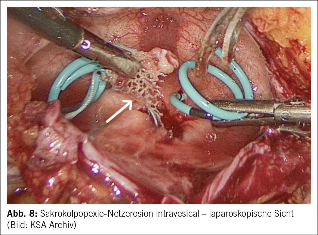 Verletzungen von Hohlorganen (Harnblase oder Rektum) treten bei netzunterstützten Verfahren häufiger auf (15) und sollen zweischichtig übernäht werden. Während eine Netzimplantation bei intraoperativen Blasenverletzungen als unkritisch angesehen wird, sollte die Netzeinlage bei Darmverletzungen aus forensischer Sicht vermieden werden.