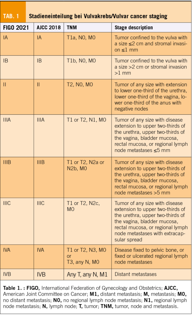 Das Vulvakarzinom kann anhand des FIGO-Staging-Systems und der TNM-Klassifikation eingeteilt werden (Tabelle 1). Da es jedoch keine ausreichenden Belege dafür gibt, die Behandlung auf das FIGO-Staging 2021 zu stützen, wird die TNM-Klassifikation empfohlen (4).