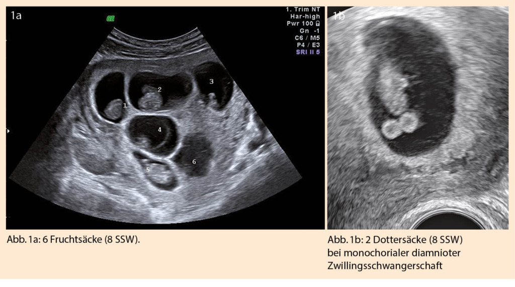 Wird eine höhergradige Mehrlingsschwangerschaft diagnostiziert, gelten dieselben Regeln zur Bestimmung der Chorionizität/Amnionizität wie bei Zwillingsschwangerschaften (Abb. 1a). Da diese Schwangerschaften mit noch höheren Komplikationsraten und grosser psychosozialen Belastungen einhergehen können, kann sich die Frage nach einer fetalen Reduktion stellen. Die Reduktion einer Drillingsschwangerschaft auf Zwillinge, kann zu einer Schwangerschaftsverlängerung von ca. 3 Wochen führen (12), geht gleichzeitig aber mit einer Abortrate von 5-7% einher (13, 14). Es empfiehlt sich vorgängig ein umfassendes Aneuploidie-Screening durchzuführen. Die Entscheidungsfindung des Paares kann selbstverständlich sehr unterschiedlich sein und hängt vom sozialen Hintergrund und deren Glaubenseinstellungen ab (15).