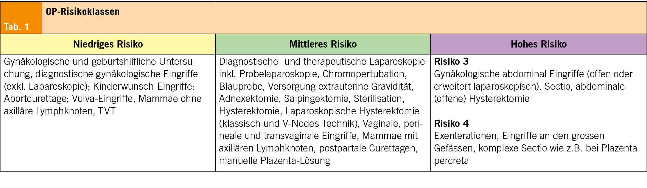 Entsprechend den britischen NICE-Guidelines (6) macht es Sinn, sich anhand der Vorerkrankungen der Patientin sowie der OP-Risikoklasse in einem nächsten Schritt ein Bild über die präoperativen Abklärungen zu machen (Tab. 1).