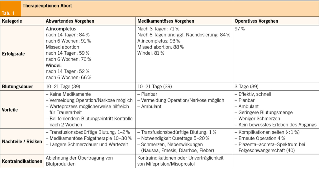 Nach der Diagnosestellung einer gestörten Frühgravidität werden die Therapieoptionen (abwartendes, medikamentöses und operatives Vorgehen), deren Vor- und Nachteile sowie die Risiken und Komplikationen im Sinne eines Shared decision making mit der Patientin besprochen (Tab. 1).
