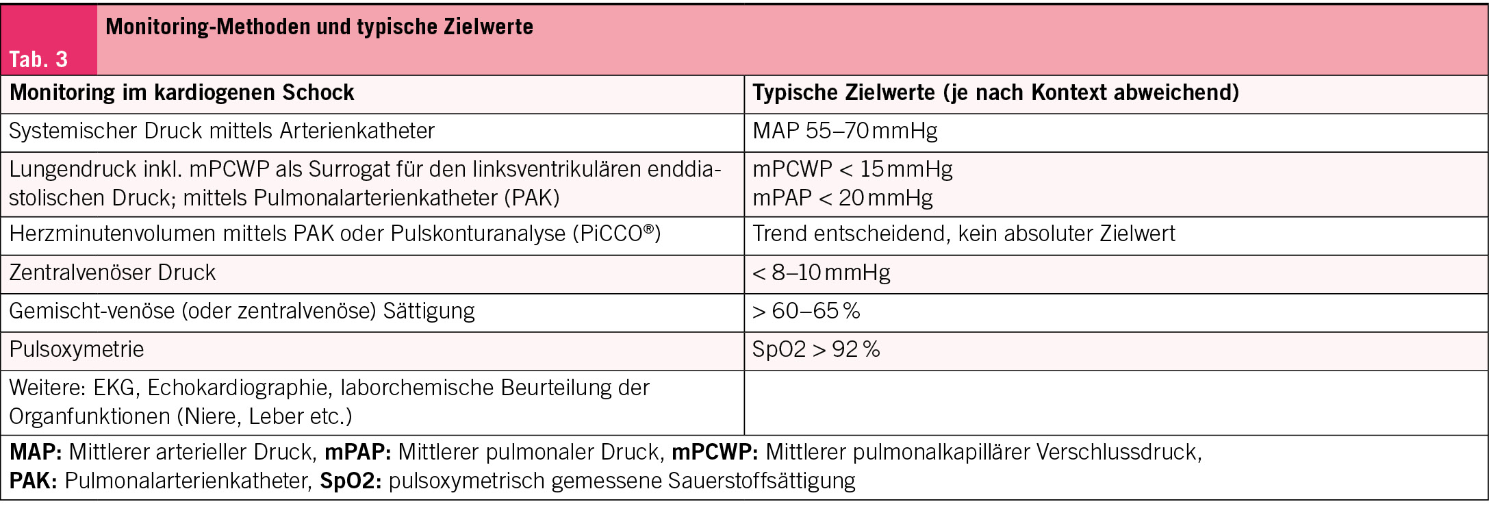 Der Einsatz eines adäquaten Monitorings ist also zentral, auch wenn hierfür die Evidenz fehlt und der Umfang häufig von den Gewohnheiten der jeweiligen Institution abhängt. Tabelle 3 gibt einen Überblick über die verfügbaren und oft angewendeten Methoden sowie einen typischen Zielbereich. Die angestrebten Zielwerte sind im Alltag aber je nach hämodynamischer Situation individuell festzulegen und variieren beträchtlich, wie folgende zwei Beispiele veranschaulichen:
