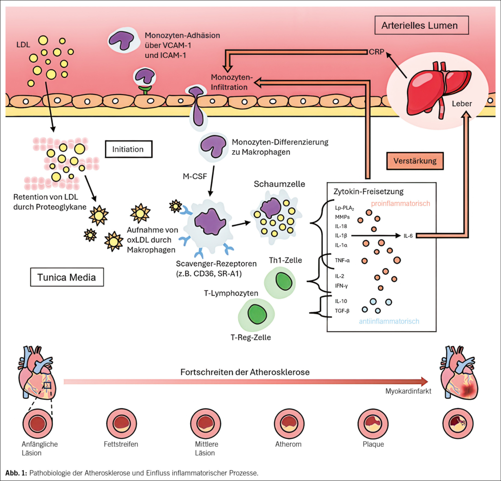 Atherosklerose wird grundsätzlich bereits in frühen Stadien durch eine endotheliale Dysfunktion initiiert. Diese entsteht infolge klassischer Risikofaktoren wie oxidiertem Low-Density-LipoÂprotein (oxLDL) respektive Dyslipidämie, arterieller Hypertonie oder Hyperglykämie. OxLDL induziert die Expression von Adhäsionsmolekülen wie VCAM-1 und ICAM-1 auf Endothelzellen und fördert dadurch die Rekrutierung von Monozyten in die Intima (1). Dort differenzieren sich diese zu Makrophagen und entwickeln sich weiter zu Schaumzellen (1, 2, 4). Diese sezernieren proinflammatorische Zytokine wie IL-1β, IL-6 und Tumornekrosefaktor-α (TNF-α), welche die Entzündung in der Gefässwand verstärken und aufrechterhalten (1, 2, 4). Diese chronische Inflammation trägt wesentlich zur Plaque-Entwicklung und -Progression bei.