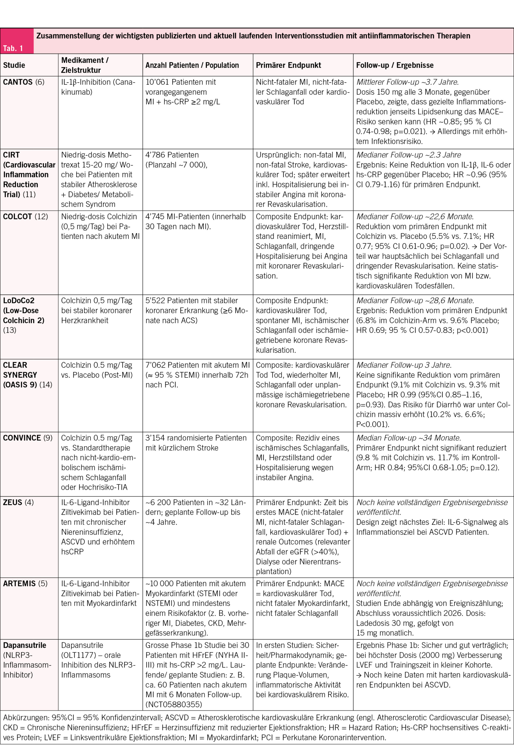 Atherosklerotische Erkrankungen bleiben trotz Kontrolle klassischer Risikofaktoren eine Hauptursache kardiovaskulärer Morbidität und Mortalität, u. a. wegen eines entzündlich bedingten Restrisikos (RIR). Chronische subklinische Inflammation