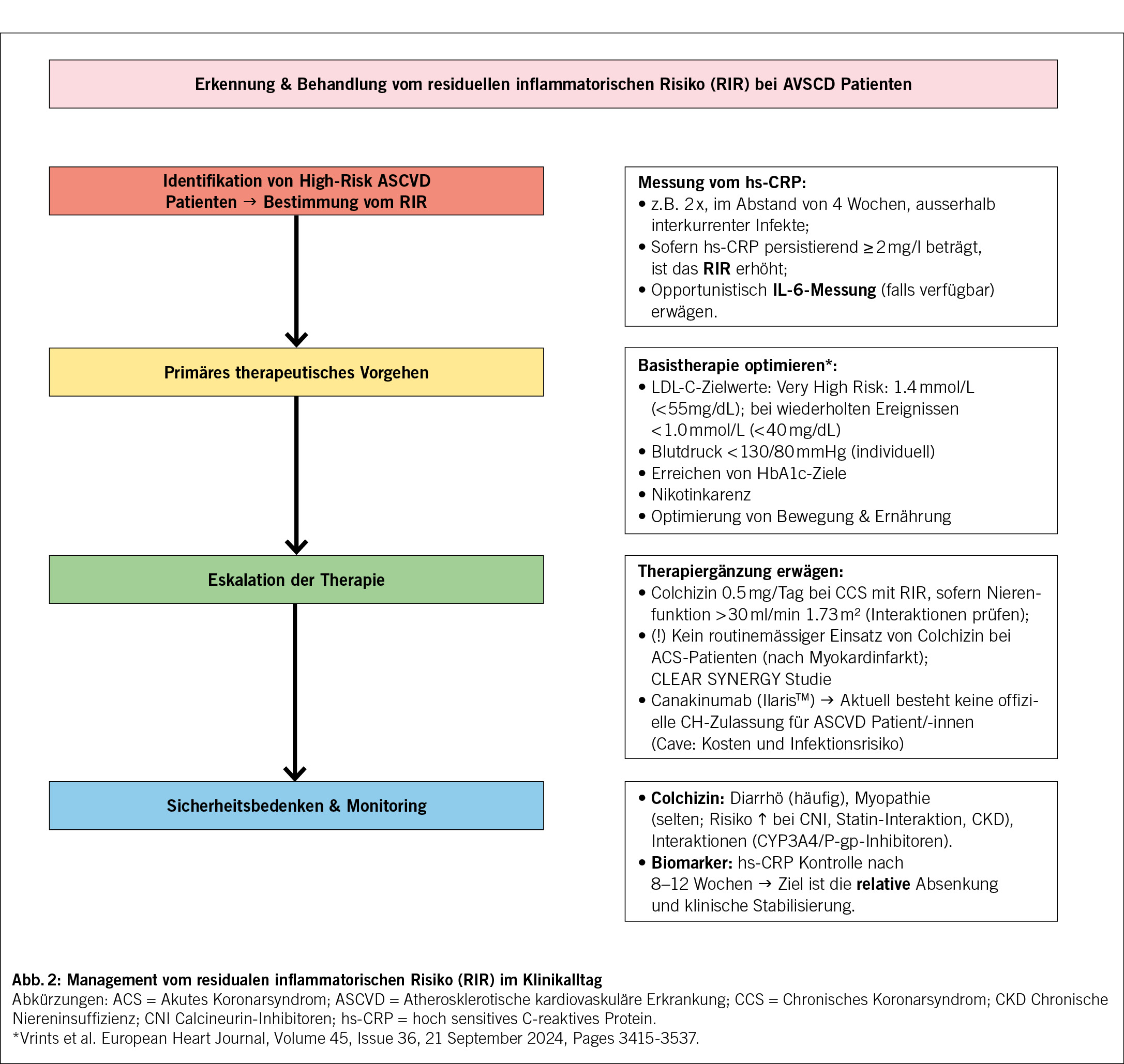 Nicht zuletzt wird auch der Kosten-Nutzen-Faktor massgeblich (4) entscheiden, ob und in welchem Umfang sich neue Medikamente zur Inhibition inflammatorischer Signalwege in der Therapie der Atherosklerose etablieren können. Die Abb. 2 fasst zusammen, wie im klinischen Alltag das residuale inflammatorische Risiko (RIR) zu erfassen ist und entsprechend therapeutische Massnahmen ergriffen werden können.