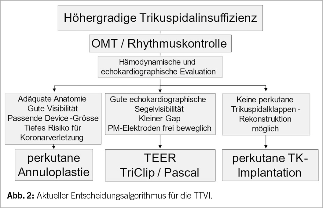 Die Wahl der alternativen, katheterbasierten TK-Intervention (TTVI) ist ebenfalls komplex (Abb. 2). Neben den anatomischen Gegebenheiten ist auch ein umfassendes Verständnis der physiologischen und hämodynamischen Bedingungen wichtig für den Erfolg der Klappenintervention (Tab. 1) (15). Eine multimodale Evaluation, welche nicht-invasive und invasive Untersuchungen kombiniert, ist zentral und sollte idealerweise in einem euvolämen Patientenzustand durchgeführt werden. Dabei sind die zu erwartenden hämodynamischen Auswirkungen einer TTVI zu beachten: Eine Reduktion der TI erhöht akut die Nachlast des RV, was zu einer Verschlechterung der RV-Funktion führen kann. Langfristig zeigen sich aber auch eine Reduktion des RV-Volumens und Verbesserung der RV-Kontraktilität durch Reduktion der Volumenbelastung. Aktuelle Studien konnten trotz initial echokardiographischer Verschlechterung der RV-Funktion eine Verbesserung von Schlagvolumen und Herzminutenvolumen nach TTVI dokumentieren (16, 17).