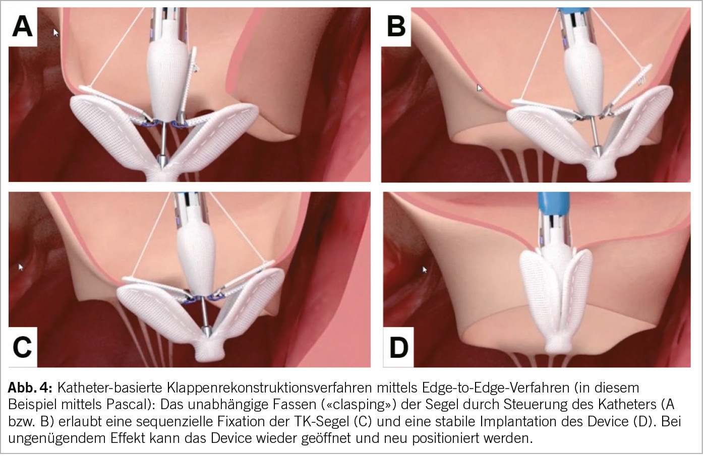 Das PASCAL-Reparatursystem (Edwards Lifesciences) ist in zwei Grössen erhältlich. Das PASCAL P10 Device verfügt über einen zentralen Spacer und zwei breitere Klammerarme, während das PASCAL Ace System über dünnere Klammerarme und einen schlankeren Spacer verfügt. Für den Einsatz in der Triksupidalklappe kommt aufgrund der anatomischen Komplexität und Fragilität der Trikuspidalklappe fast ausschliessen das PASCAL Ace System in Frage (22). Vorläufige Resultate der aktuell laufenden Studien (CLASP TR und TRICLASP) bei Patienten mit schwerer TI zeigten nach 30 Tagen eine Abnahme der TI auf lediglich leicht bis mittelschwer bei 86% bis 90% (23, 24). Der enddiastolische RV-Durchmesser wurde signifikant reduziert, während das LV-Schlagvolumen sowie der funktionelle Status, die körperliche Leistungsfähigkeit und Lebensqualität signifikant verbessert werden konnten. Weitere prospektive, randomisierte Studien, die den TriClip und das Pascal-Device mit optimaler medikamentöser Therapie und alternativen Methoden vergleichen, sind geplant.