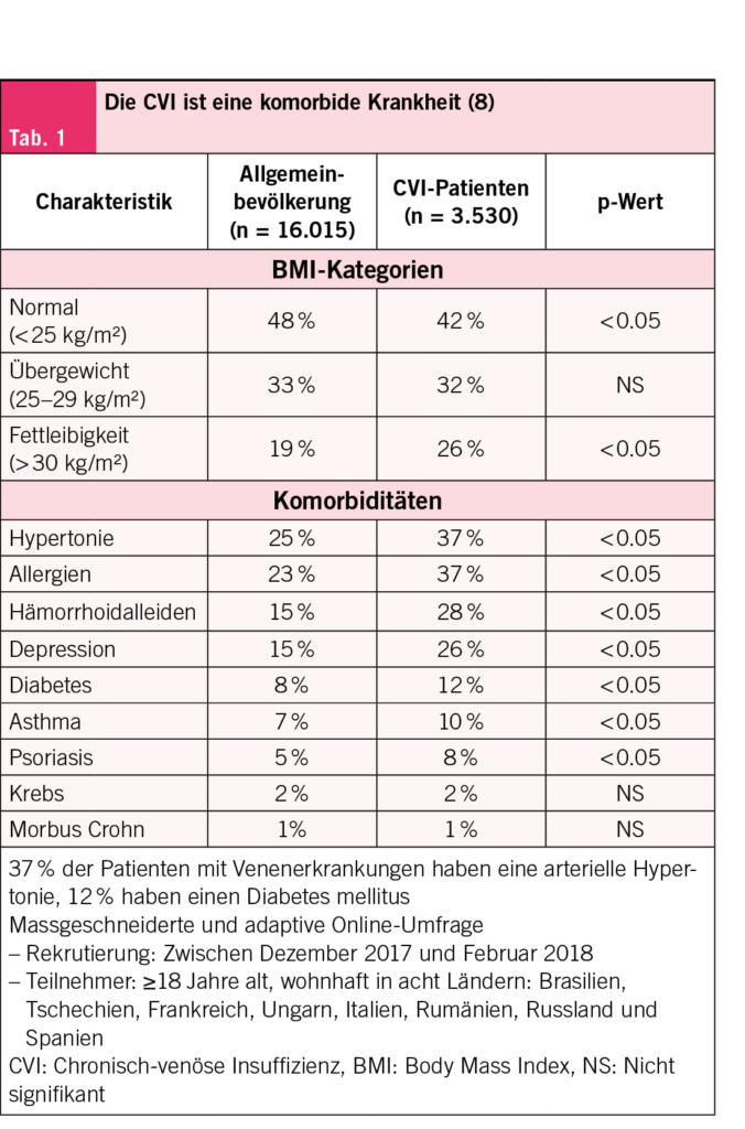 Sie teilen jedoch gemeinsame Risikofaktoren und Schnittstellen in der Pathophysiologie (Abb. 1). Gemeinsame Risikofaktoren wie Adipositas, arterielle Hypertonie, Nikotin, Diabetes mellitus und Alter spielen eine zentrale Rolle bei der Ausbildung beider Erkrankungen. In einer Studie von Rabe et al. (2) konnte gezeigt werden, dass 37 % der Patienten mit chronischen Venenerkrankungen eine arterielle Hypertonie und 12 % einen Diabetes mellitus haben (Tab. 1).
