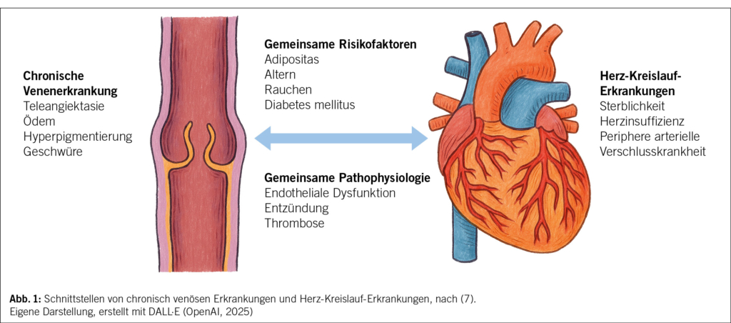 Herz-Kreislauf-Erkrankungen wie die periphere arterielle Verschlusskrankheit (PAVK) und die chronisch venöse Insuffizienz (CVI) werden im klinischen Alltag oft als unterschiedliche Entitäten betrachtet. Chronisch venöse Erkrankungen und Herz-Kreislauf-Erkrankungen haben gemeinsame Risikofaktoren und eine gemeinsame Pathophysiologie. Studien konnten zeigen, dass häufig eine Koexistenz beider Krankheitsbilder vorhanden ist, die sich gegenseitig beeinflussen. Dieser Artikel soll eine Ăœbersicht verschaffen Ă¼ber die epidemiologische Koexistenz, die pathophysiologischen Interaktionen sowie die therapeutischen Herausforderungen im klinischen Alltag.