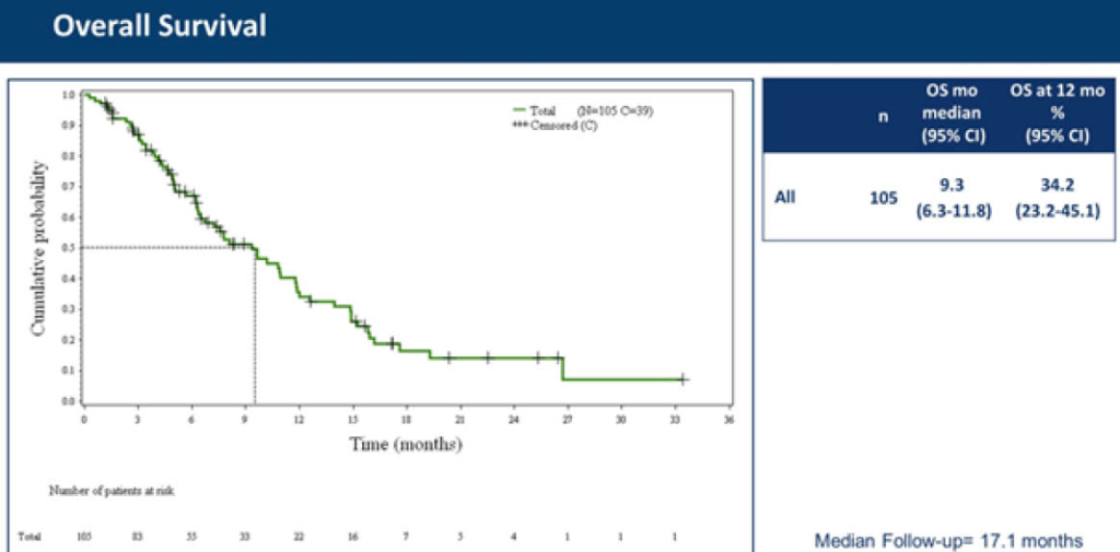 Nach einer medianen Beobachtungsdauer von 17.1 Monaten betrug das mediane OS 9.3 Monate und das 1  -  Jahres OS betrug 34.2%. Für auf eine vorgängige Therapie ansprechende Patienten betrug das OS 11.9 Monate versus 5.0 Monate für primär resistente Patienten. Eine grosse Phase 3 Zulassungs-Studie («Atlantis» N:600) von Lurbinectdin+Doxorubicin versus Standardtherapie sollte Mitte Jahr die nötige Fallzahl erreicht haben. Nun endlich nach >20 Jahren wieder ein klar aktives Medikament beim Kleinzeller!