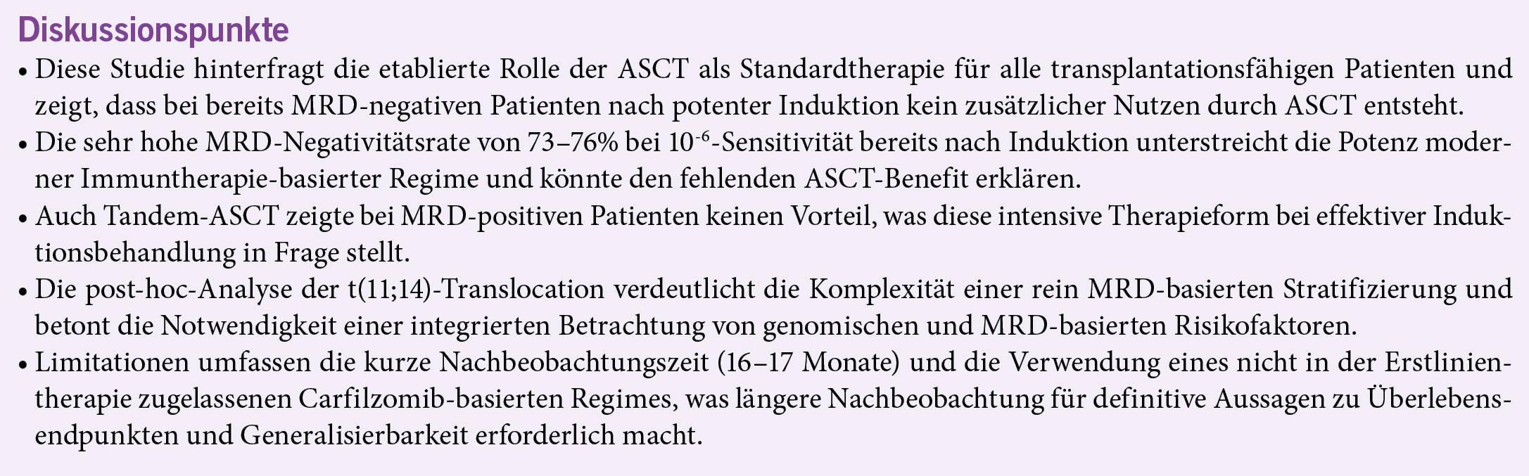 Bei Patienten mit MRD-Negativität nach Induktion führte ASCT nicht zu einer signifikant höheren Rate an MRD-Negativität bei 10-6-Sensitivität im Vergleich zu alleiniger Isa-KRd-Therapie. Tandem-ASCT zeigte bei MRD-positiven Patienten keinen Vorteil gegenüber Einzel-ASCT.