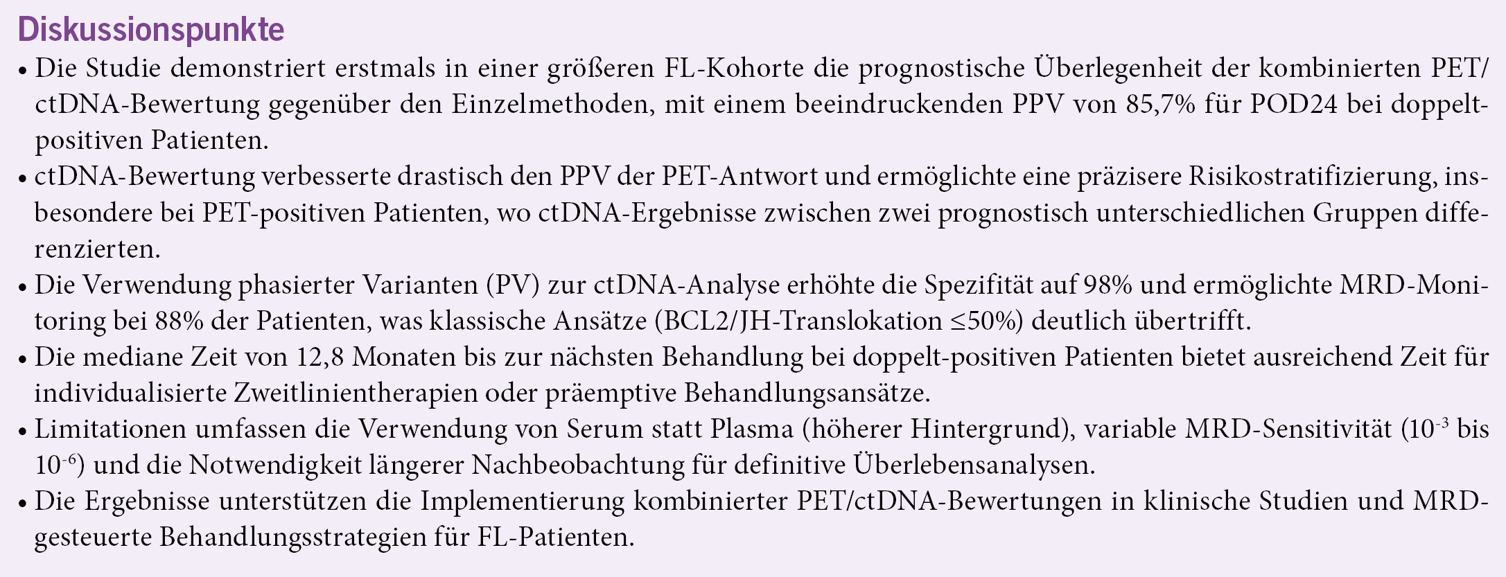 Beide Tests zeigten einen negativen Vorhersagewert (NPV) von über 90% für POD24. Der positive Vorhersagewert (PPV) betrug 58,3% für ctDNA-MRD und 45% für PET allein, stieg jedoch auf 85,7% bei Kombination beider Parameter, ohne Beeinträchtigung des NPV. Bei doppelt-positiven Patienten betrug die mediane Zeit bis zur nächsten Lymphombehandlung 12,8 Monate.