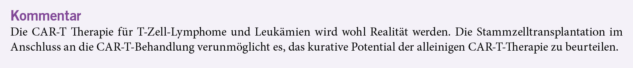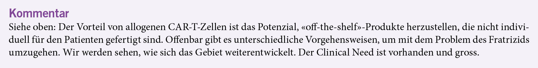Die CAR-T-Therapien haben sich etabliert: In Europa wurden bisher über 20 000 Patienten mit B-Zell-Tumoren und einige mit Autoimmunkrankheiten behandelt. Bei T-Zell-Tumoren besteht das Problem des Fratrizids (Brudermord), d. h., wenn sich die CAR-T-Zellen gegenseitig zerstören, nützt das nichts gegen den Tumor. Folgende Lösung wird hier präsentiert.