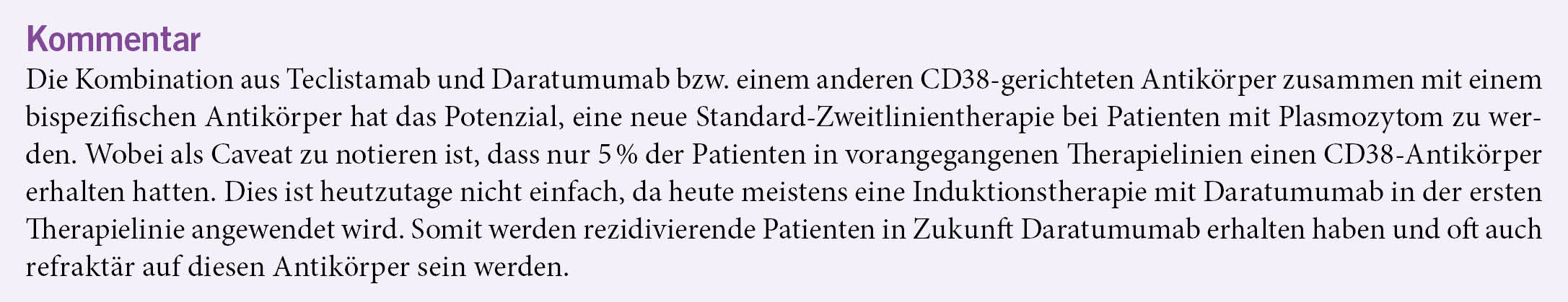 In dieser Studie wurde Talquetamab mit Teclistamab kombiniert. Besonders hervorzuheben ist die Tatsache, dass es sich um Patienten mit «wahrer» extramedullärer Krankheit handelt, d.h. ein mit dem Knochen per continuitatem gewachsener Herd gilt nicht als extramedullär. Zum Beispiel ist ein aus einer Rippe in die Pleura einwachsender Herd in dieser Definition nicht extramedullär.